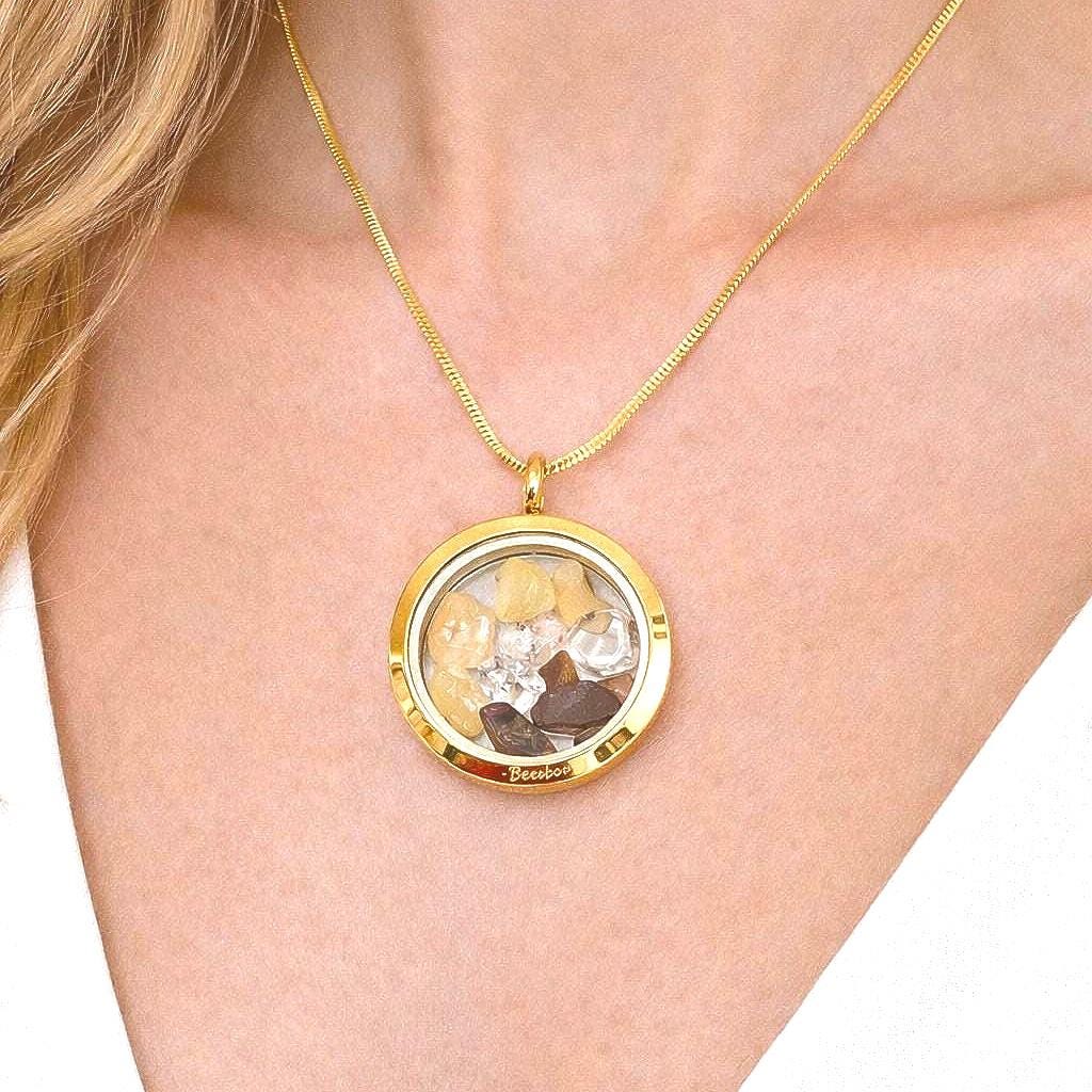 The 30mm round floating pendant is meticulously crafted with durable, crystal-clear glass to showcase the natural beauty of the gemstones within. Finished with a polished gold-filled frame and chain, this necklace offers long-lasting brilliance and a refined aesthetic suitable for everyday elegance or elevated occasions.
