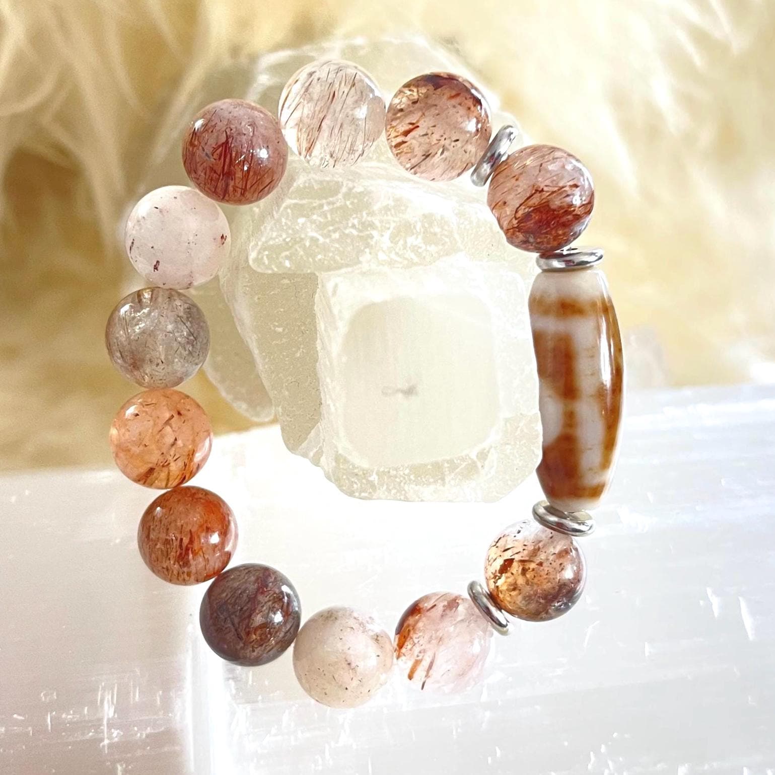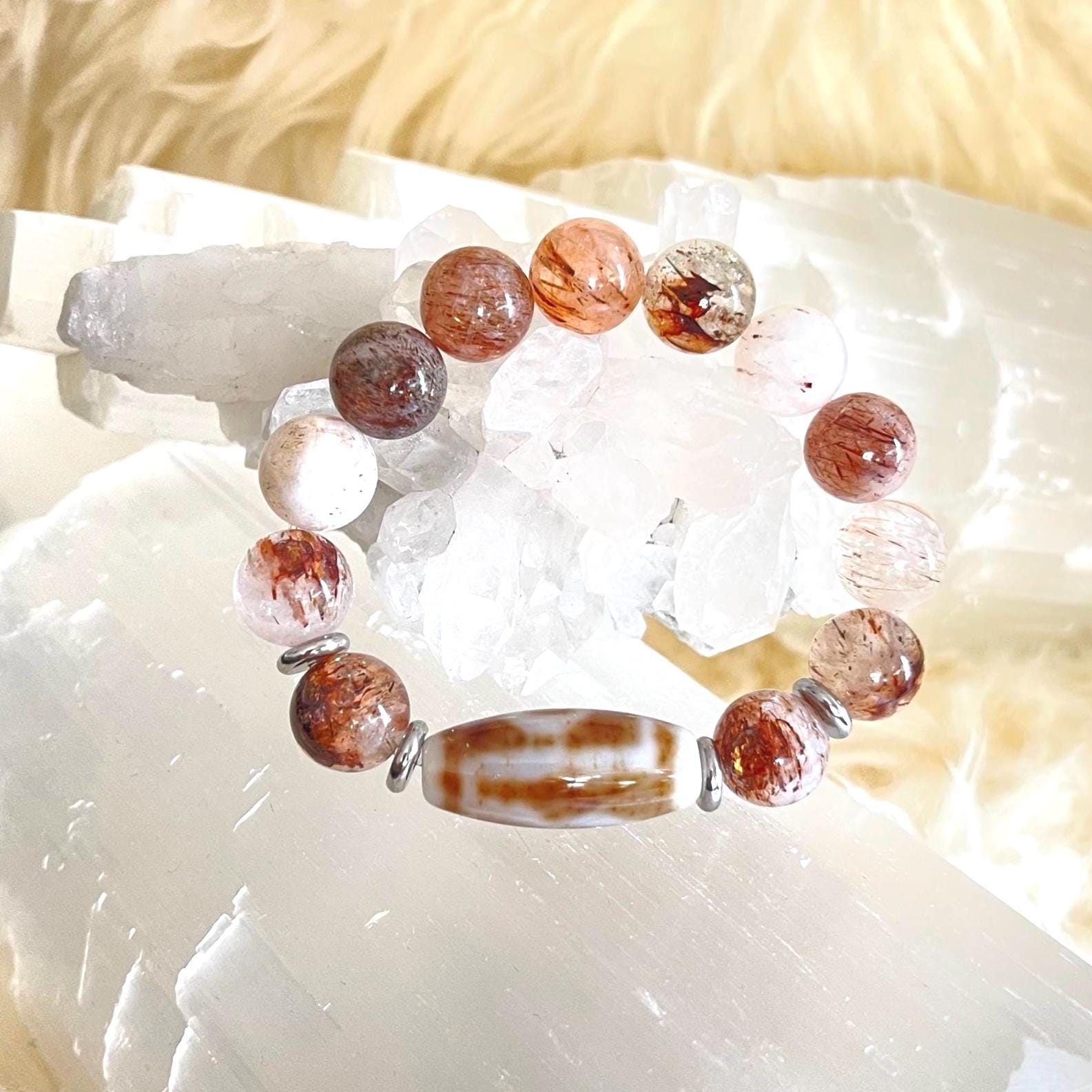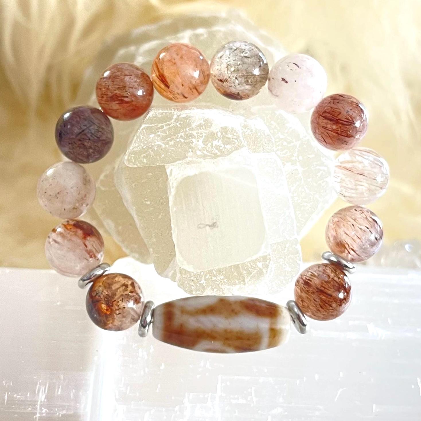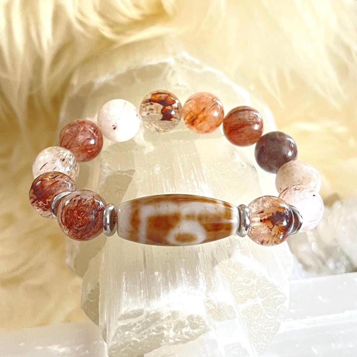 Powerful, symbolic, and deeply intentional, this Dzi Agate & Golden Red Super Seven Protection Bracelet is a refined fusion of ancient spiritual wisdom and modern luxury craftsmanship. Designed with bold 12mm natural Dzi Agate and Golden Red Super Seven gemstone beads, accented with sleek stainless steel elements, this unisex stretch bracelet is crafted to serve as a protection amulet, grounding talisman, and statement of inner strength.