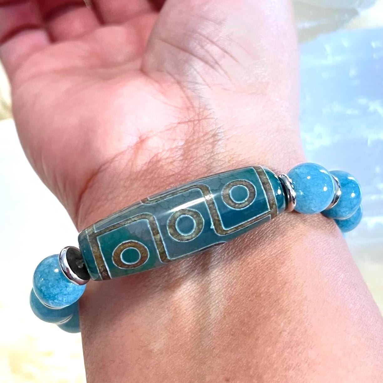 Surround yourself with calm, heavenly energy with this beautiful 9 Eye Dzi Agate Bracelet, paired with soothing Blue Angelite gemstones. Designed to inspire peace, balance, and spiritual protection, this bracelet is more than jewelry — it’s a meaningful talisman for inner harmony and positive energy.