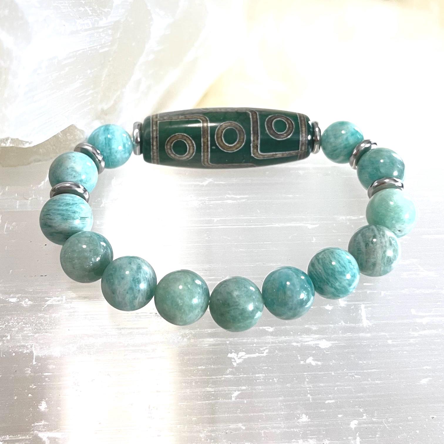 Surrounding the Dzi centerpiece are serene 10mm Amazonite gemstones, known as the “Stone of Hope” and a powerful crystal for calming the mind and encouraging honest communication.