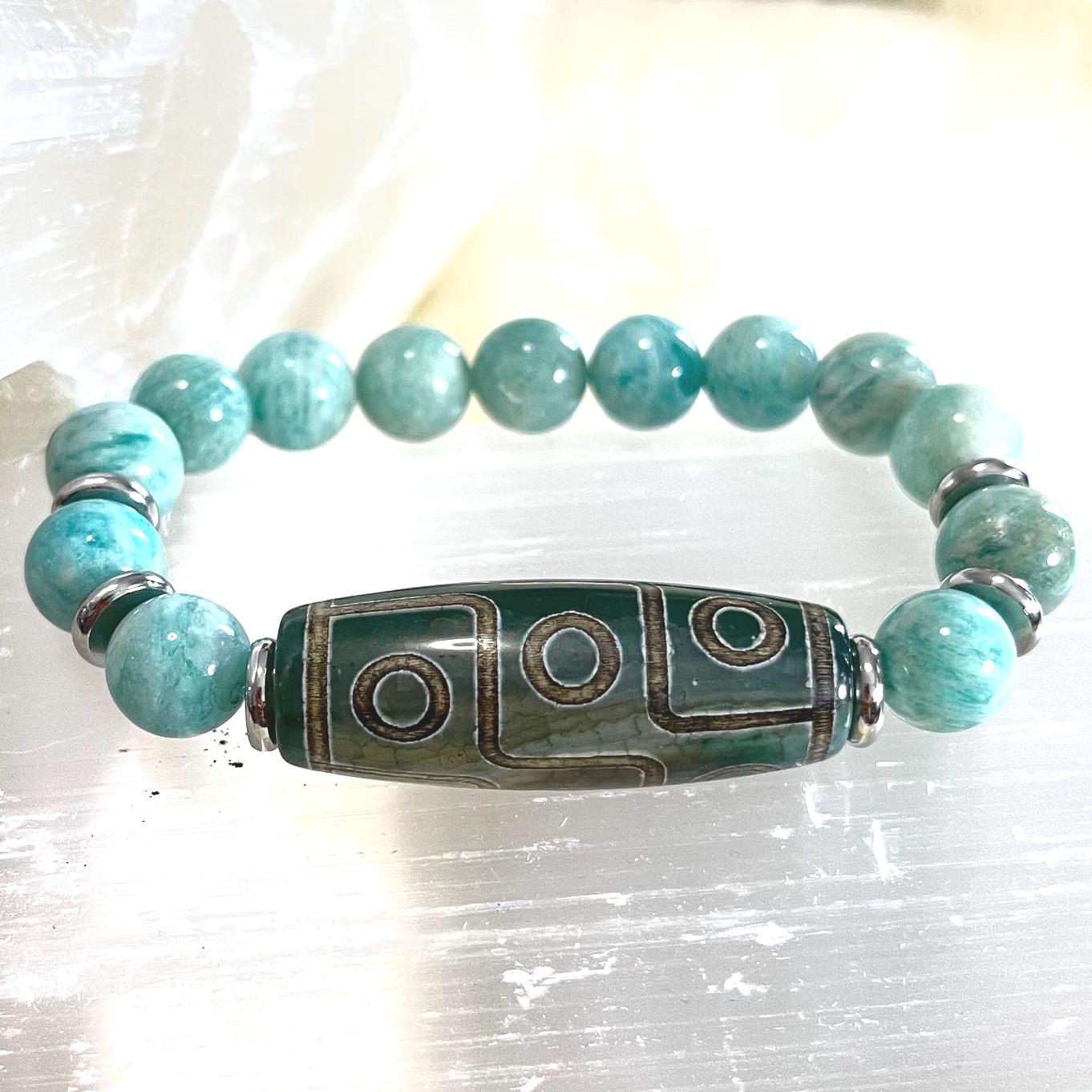 9 Eye Dzi Agate Bracelet with Amazonite – Calm, Protection & Positive Energy (10mm Beads)