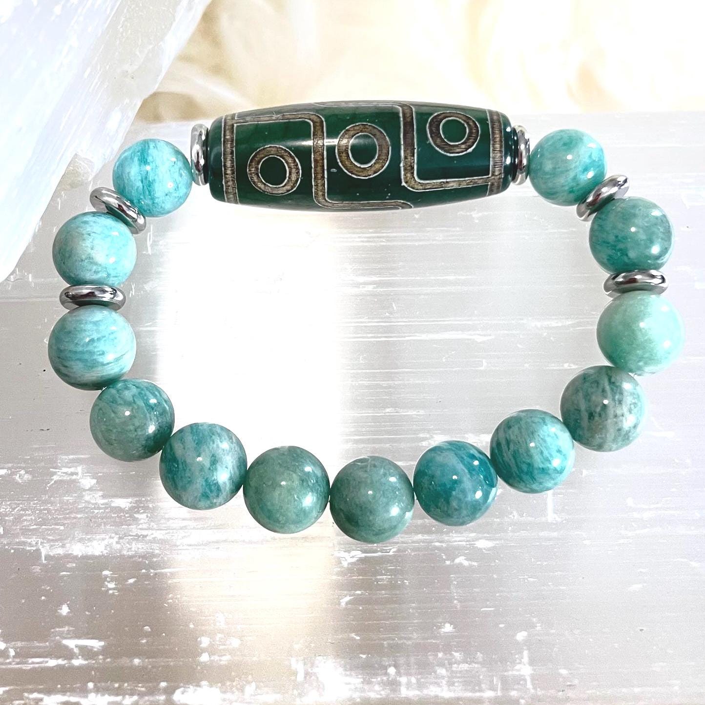 9 Eye Dzi Bracelet, Amazonite Bracelet, Tibetan Protection Jewelry, Healing Crystal Bracelet, 10mm Beaded Bracelet, Peaceful Energy Gift, Lucky Charm Bracelet, Spiritual Bracelet for Men Women