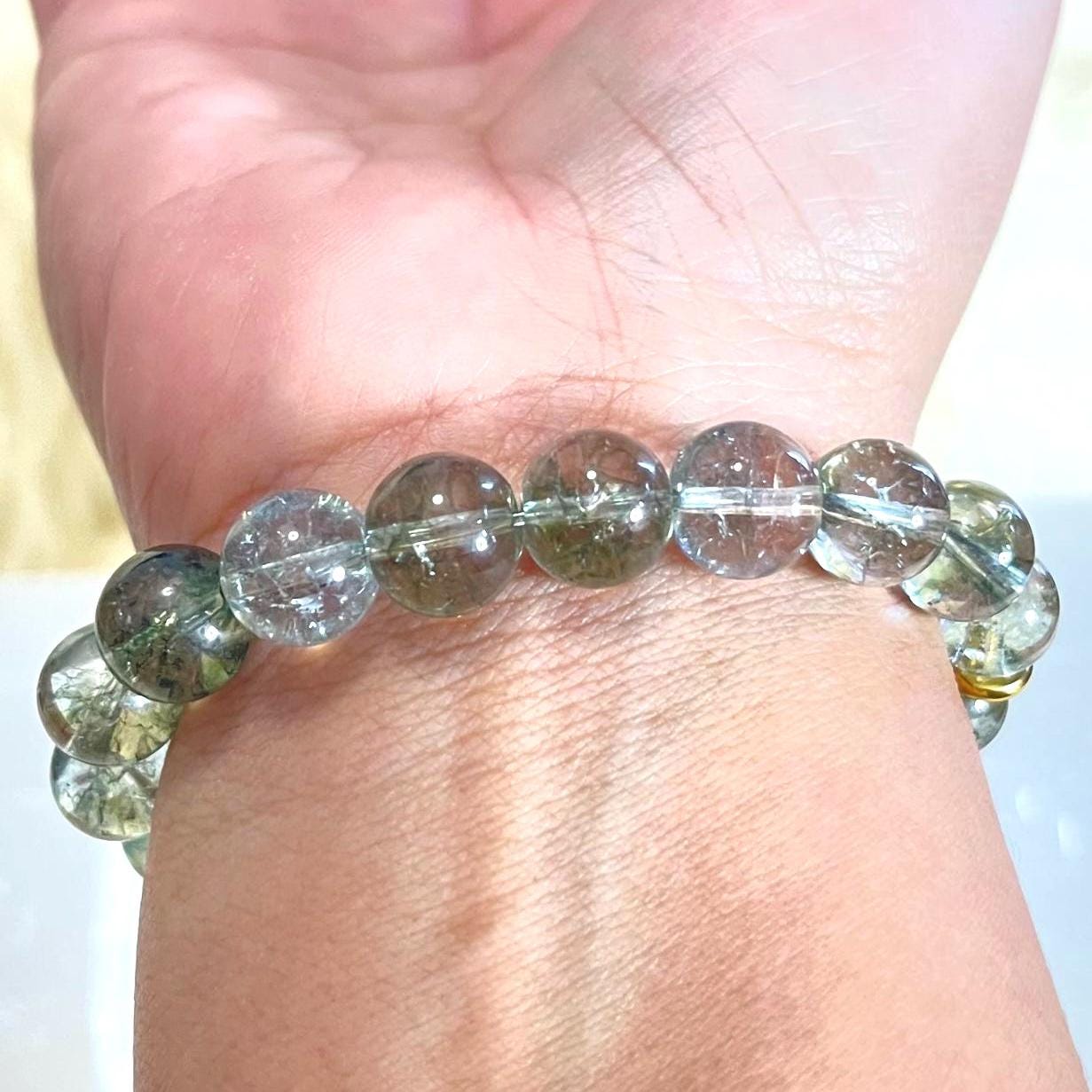 The bracelet features natural 10mm Phantom Quartz, known as the “Stone of Evolution” for its unique inclusions that resemble misty layers or landscapes within the crystal.