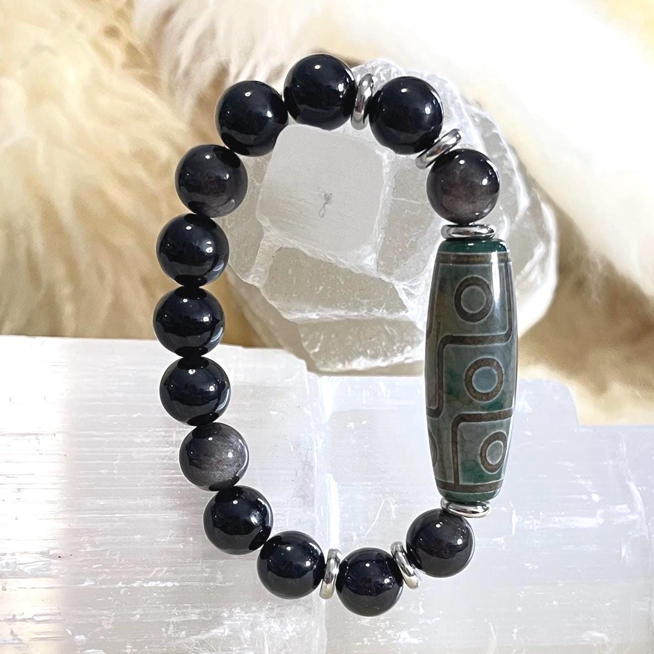 Surrounding the Dzi centerpiece are polished 10mm Obsidian gemstones, one of the most powerful stones for protection and grounding. Obsidian is often called a “psychic shield” because it is believed to absorb negativity and provide emotional strength.