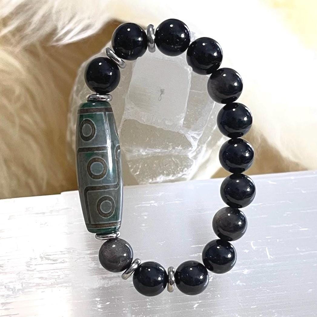 Handcrafted with bold 10mm Obsidian beads, this bracelet carries a strong, protective presence perfect for everyday wear. At its center is a sacred 9 Eye Dzi Agate bead (approximately 4cm long), creating a powerful focal point rooted in Tibetan tradition and spiritual symbolism.
