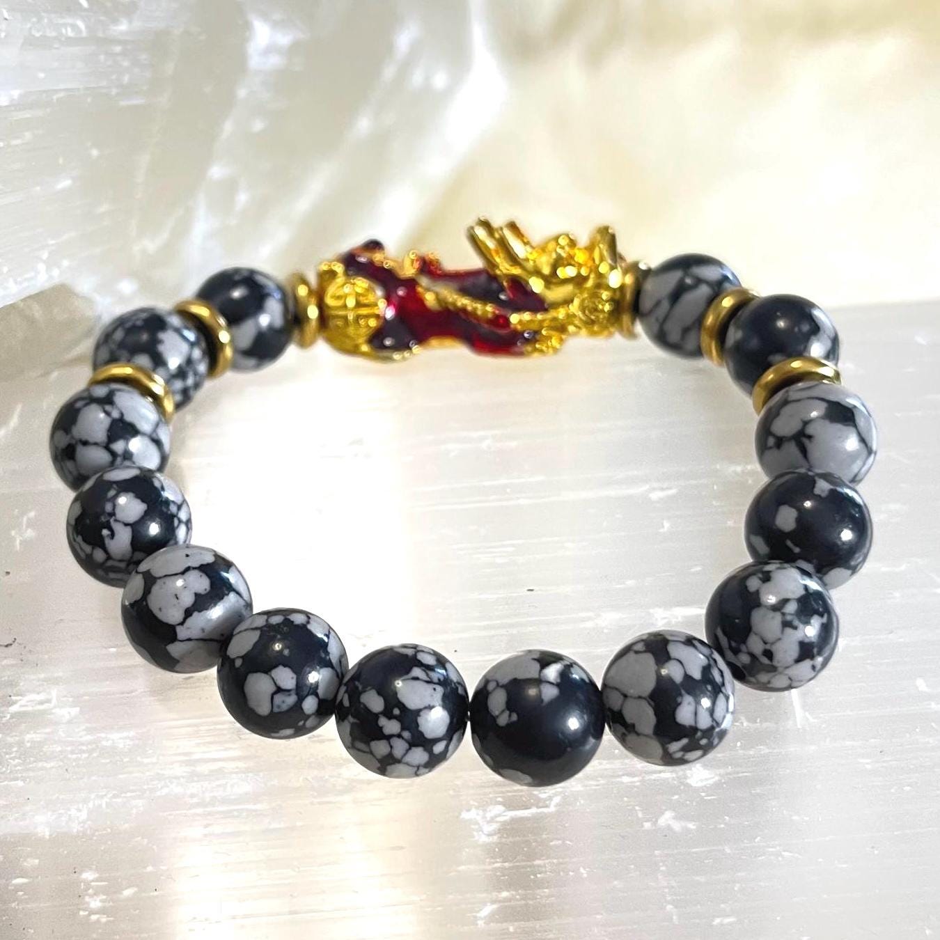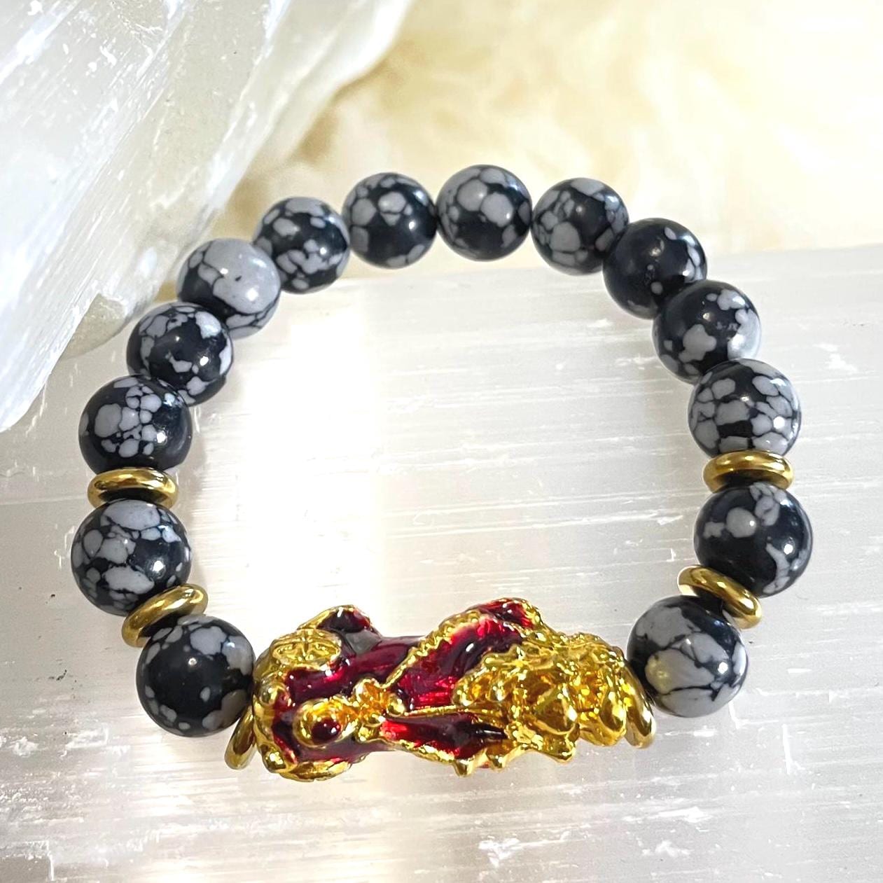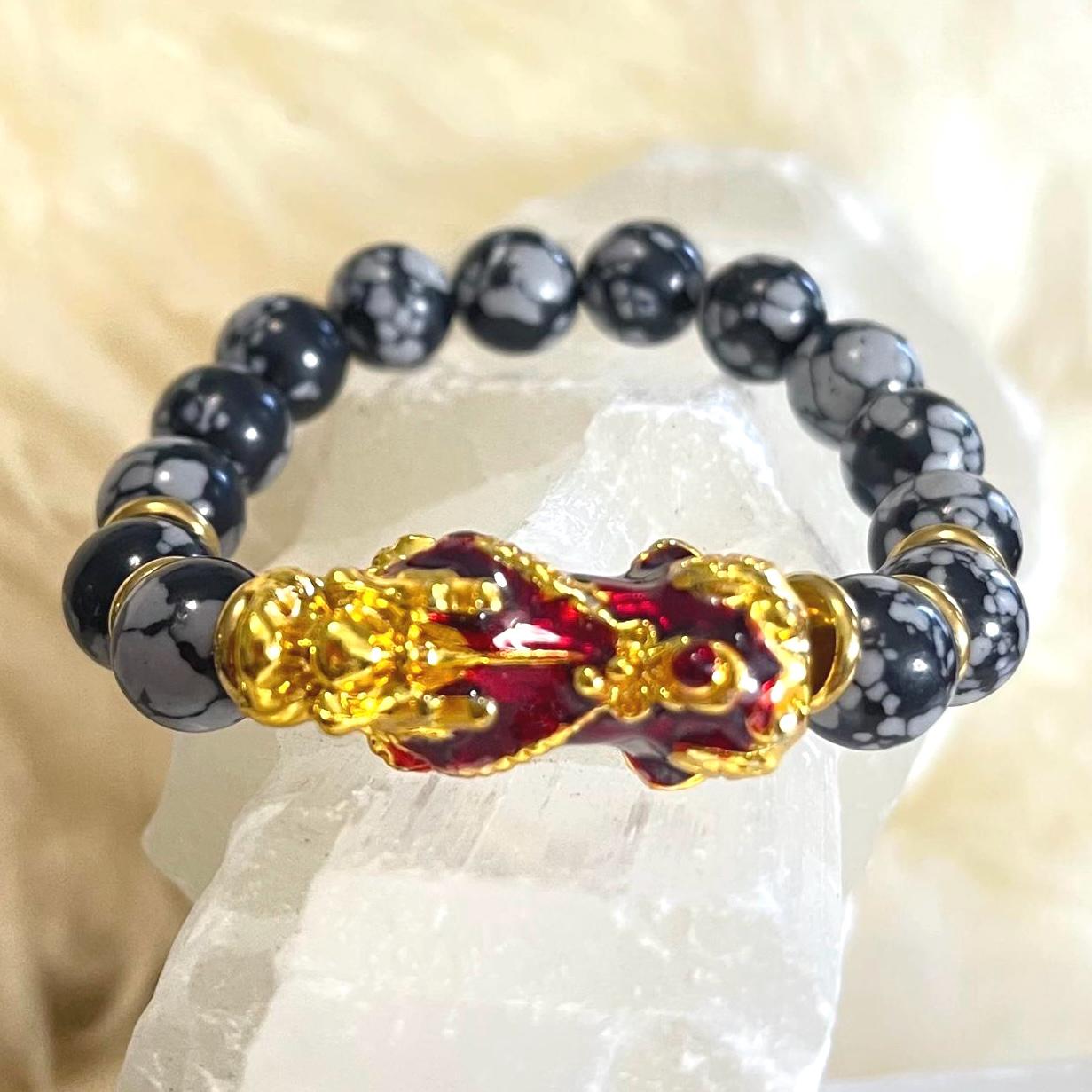 Snowflake Obsidian Pixiu Bracelet | Pixiu Wealth Bracelet | Feng Shui Money Bracelet | Gold Pixiu Charm Bracelet | Protection Crystal Bracelet 10mm | Grounding Bracelet for Healing | Obsidian Bracelet for Luck