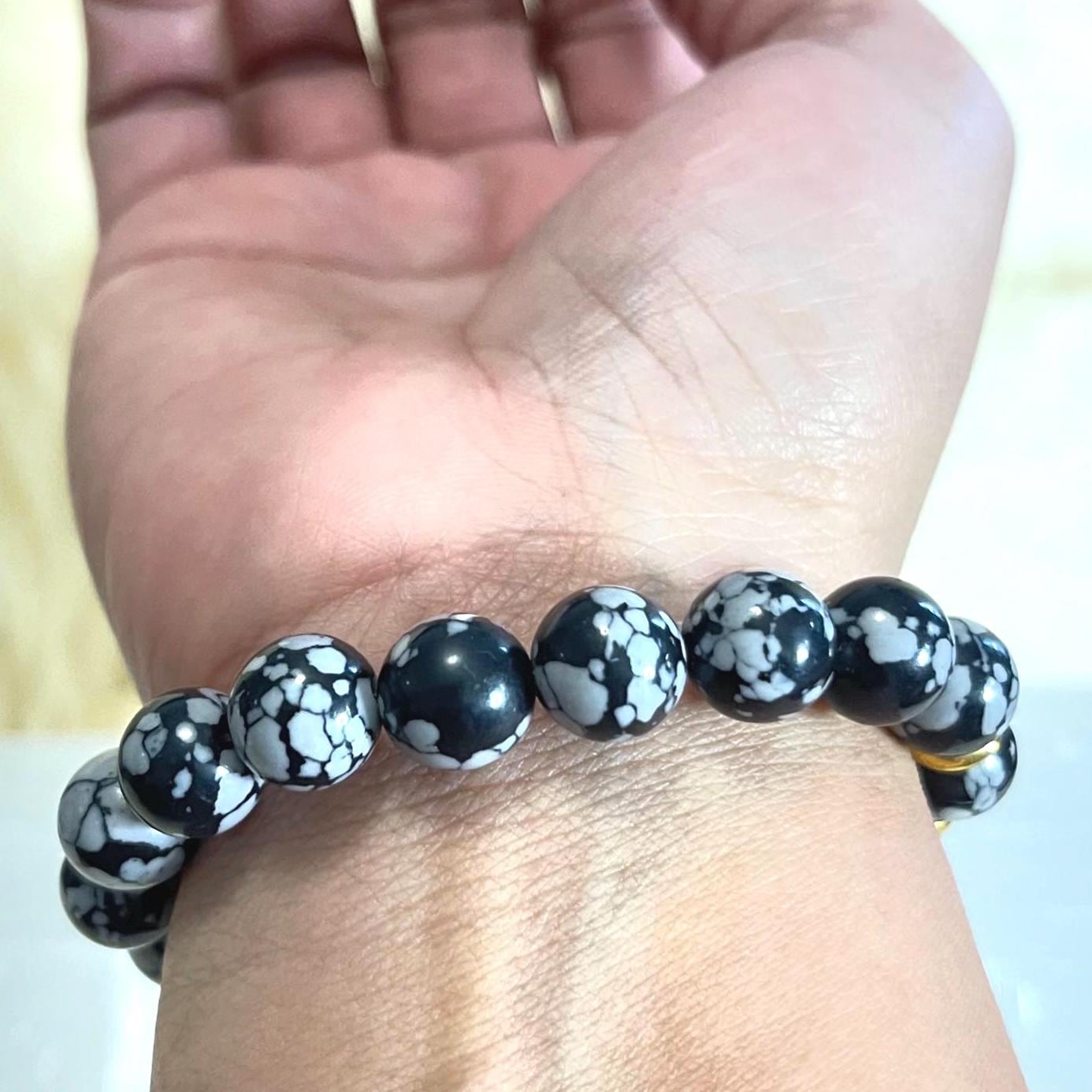 This bracelet features beautiful 10mm Snowflake Obsidian, a powerful volcanic stone known for its black surface patterned with natural white “snowflakes.”