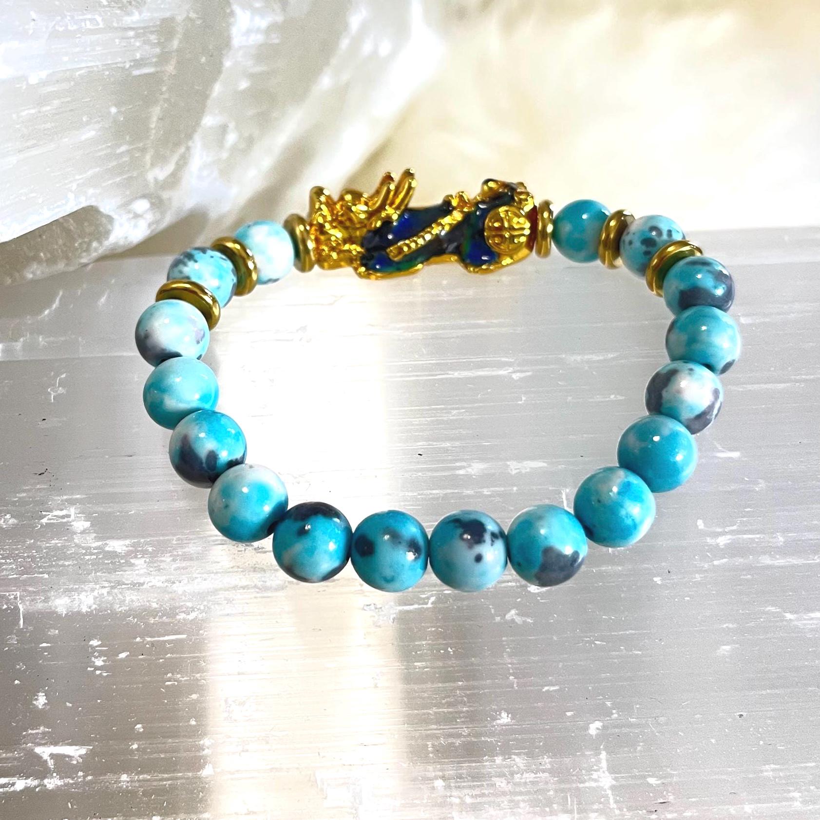 Embrace soothing energy, spiritual balance, and prosperity with this beautiful Blue Rainflower Jasper Pixiu Bracelet, crafted with natural 8mm Blue Rainflower Jasper beads, a bold gold-plated Pixiu charm, and elegant gold-plated accents. Strung on a durable elastic cord, this bracelet is designed for comfort, everyday wear, and powerful Feng Shui meaning.
