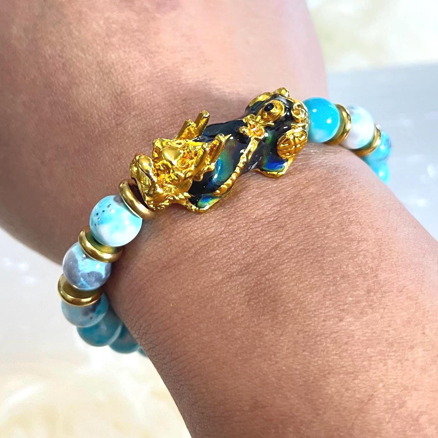 Strung on a strong elastic cord, the Blue Rainflower Jasper Pixiu Bracelet offers: