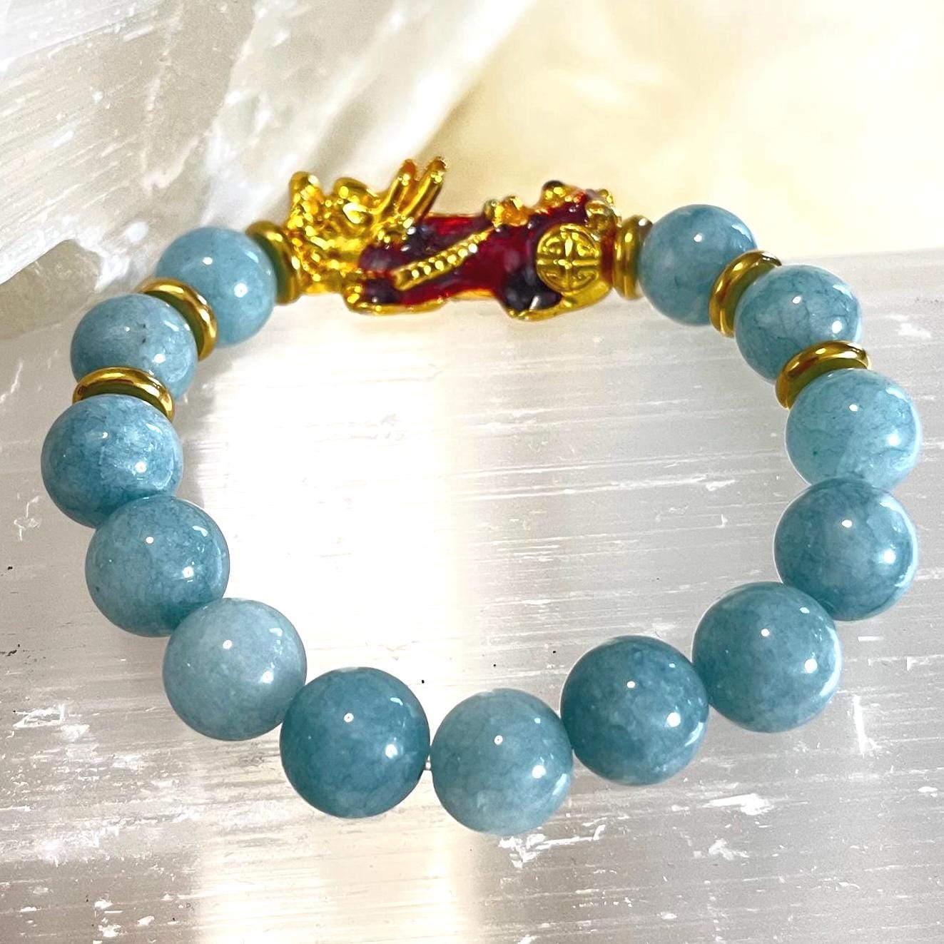 Blue Angelite Pixiu Bracelet | Pixiu Wealth Bracelet | Feng Shui Money Bracelet | Gold Pixiu Charm Bracelet | Calming Crystal Bracelet 10mm | Protection and Luck Jewelry | Angelite Bracelet for Peace