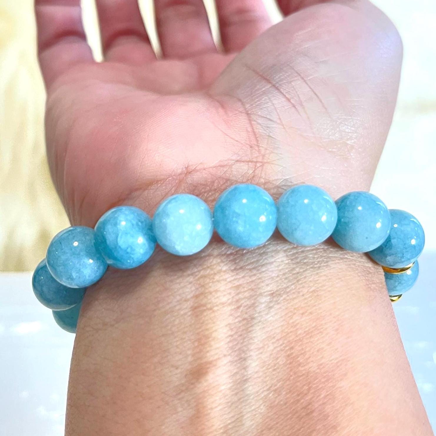 This bracelet features natural 10mm Blue Angelite, admired for its soft sky-blue color and gentle, uplifting vibration.