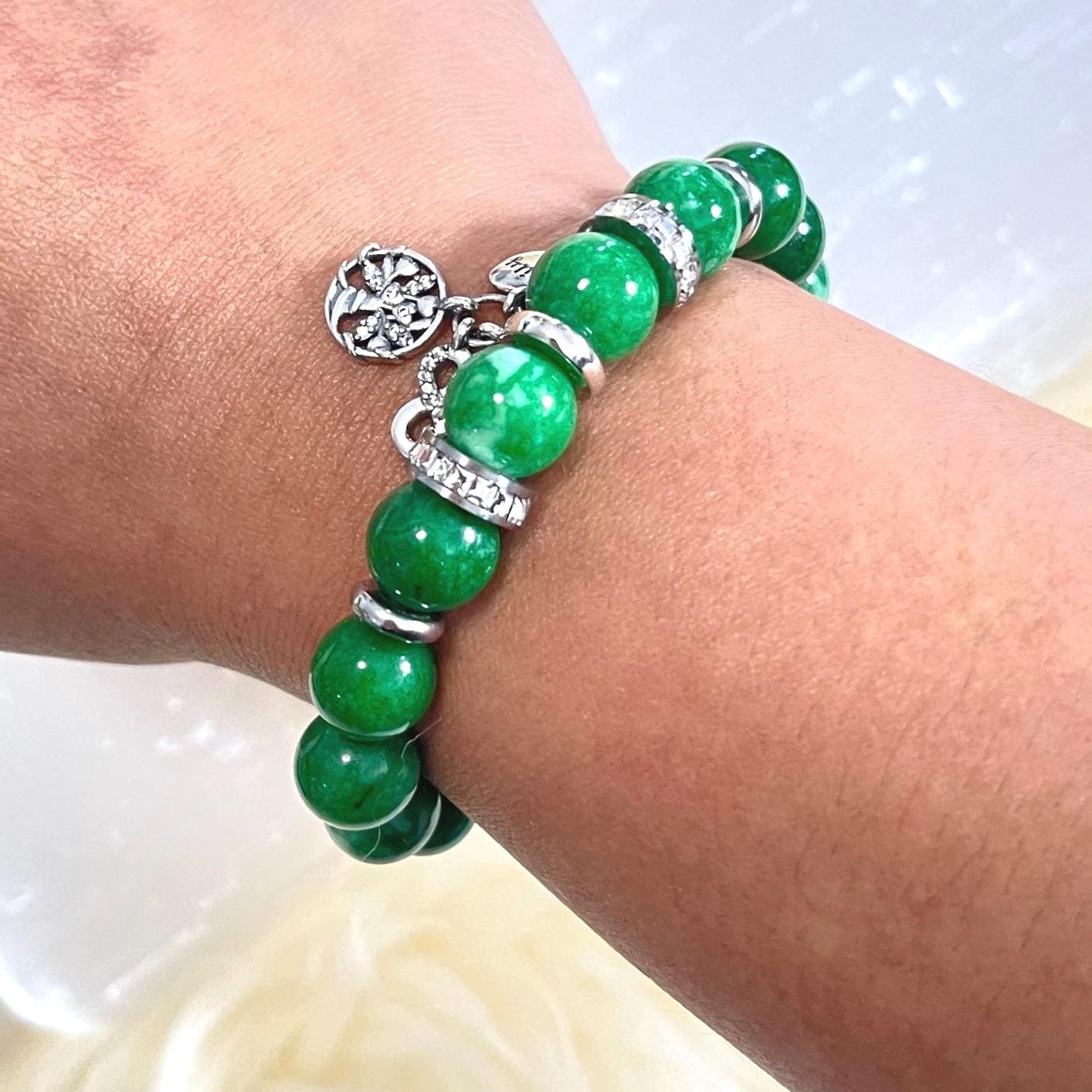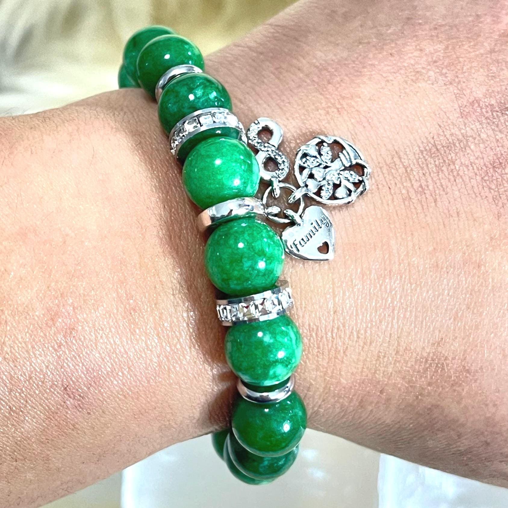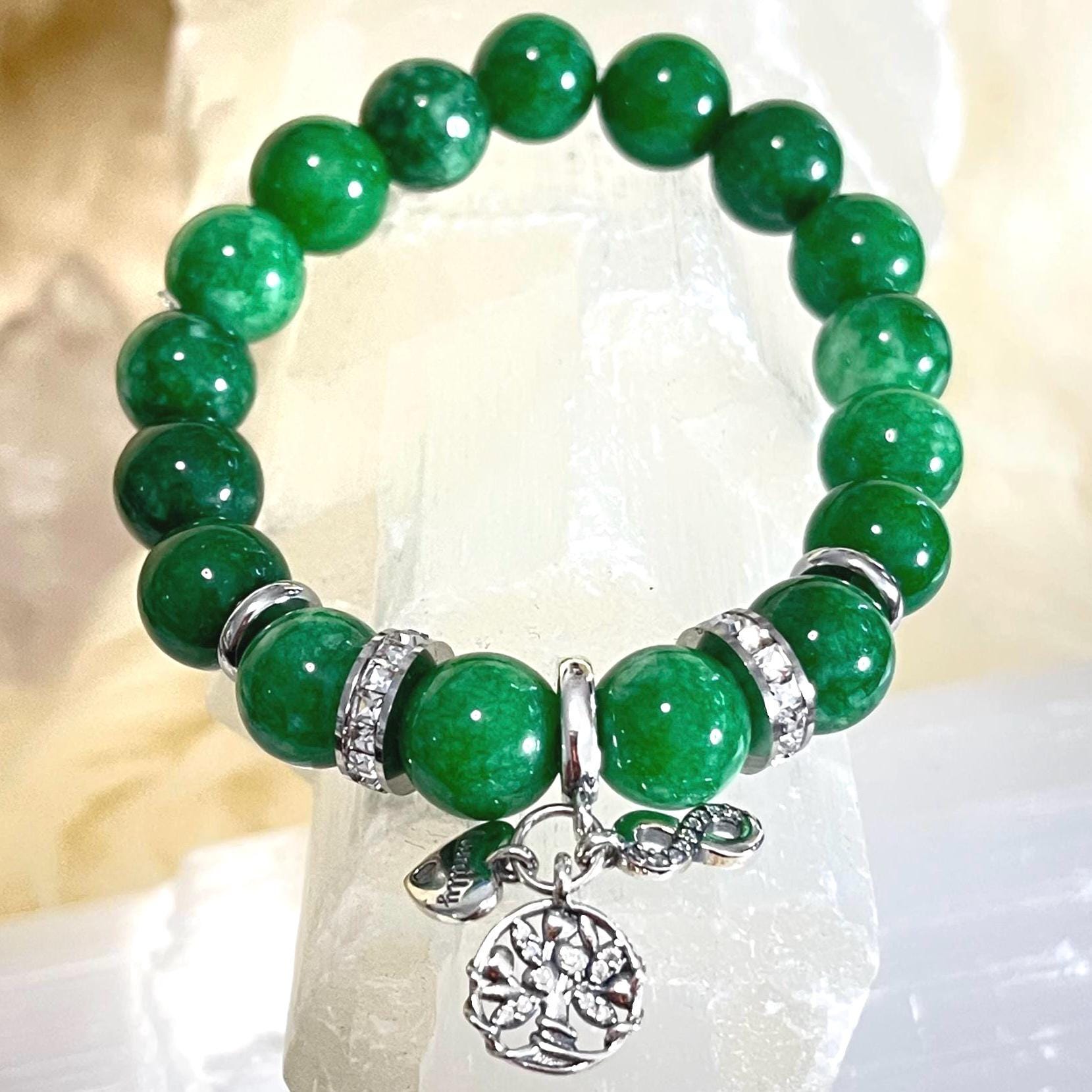 Jade 10mm Bracelet with 925 Sterling Silver Infinity, Heart & Tree of Life Charm