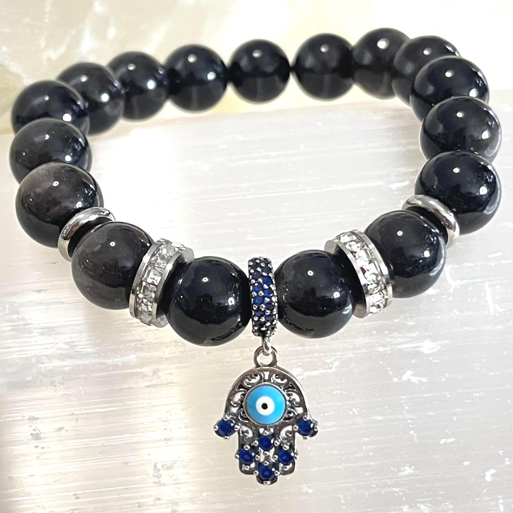 Obsidian 10mm Bracelet with 925 Sterling Silver Hamsa & Evil Eye Charm