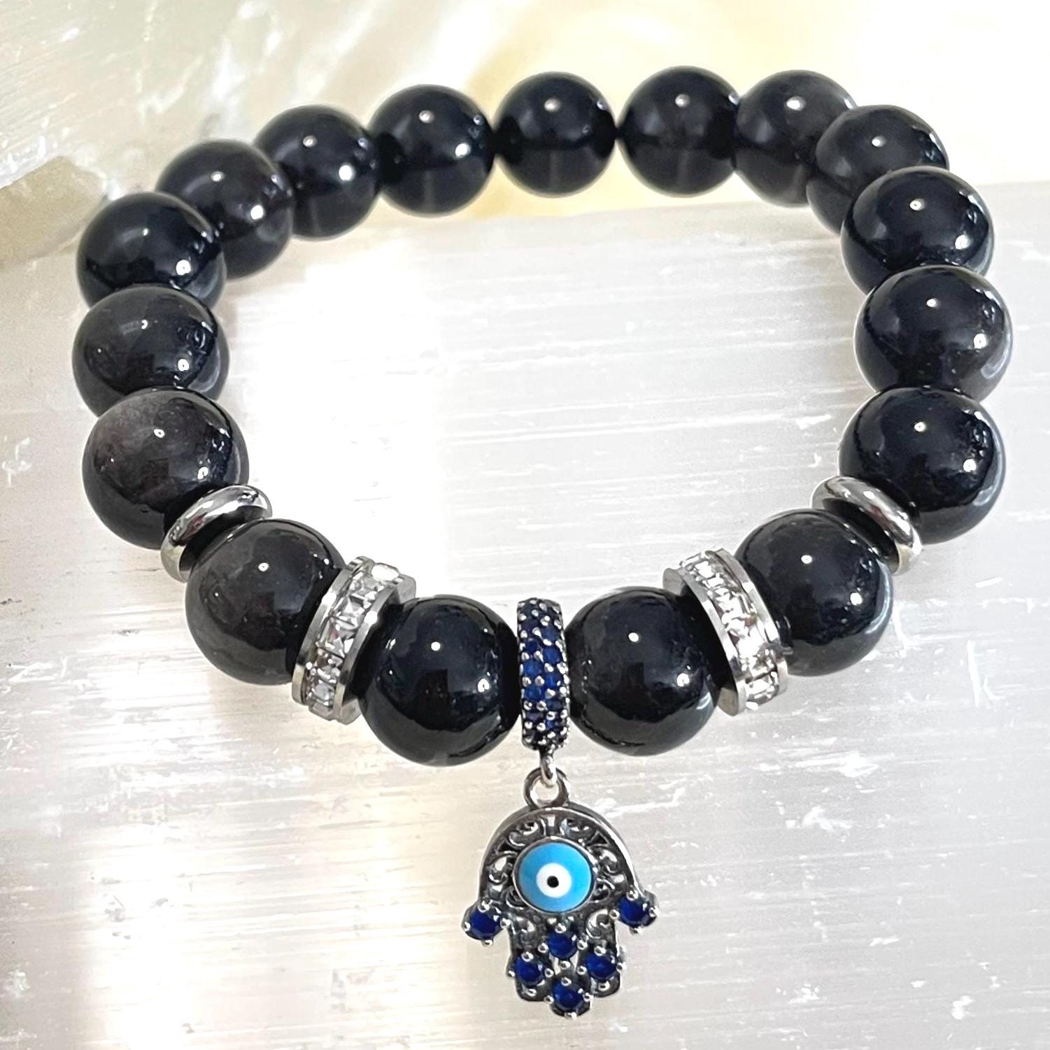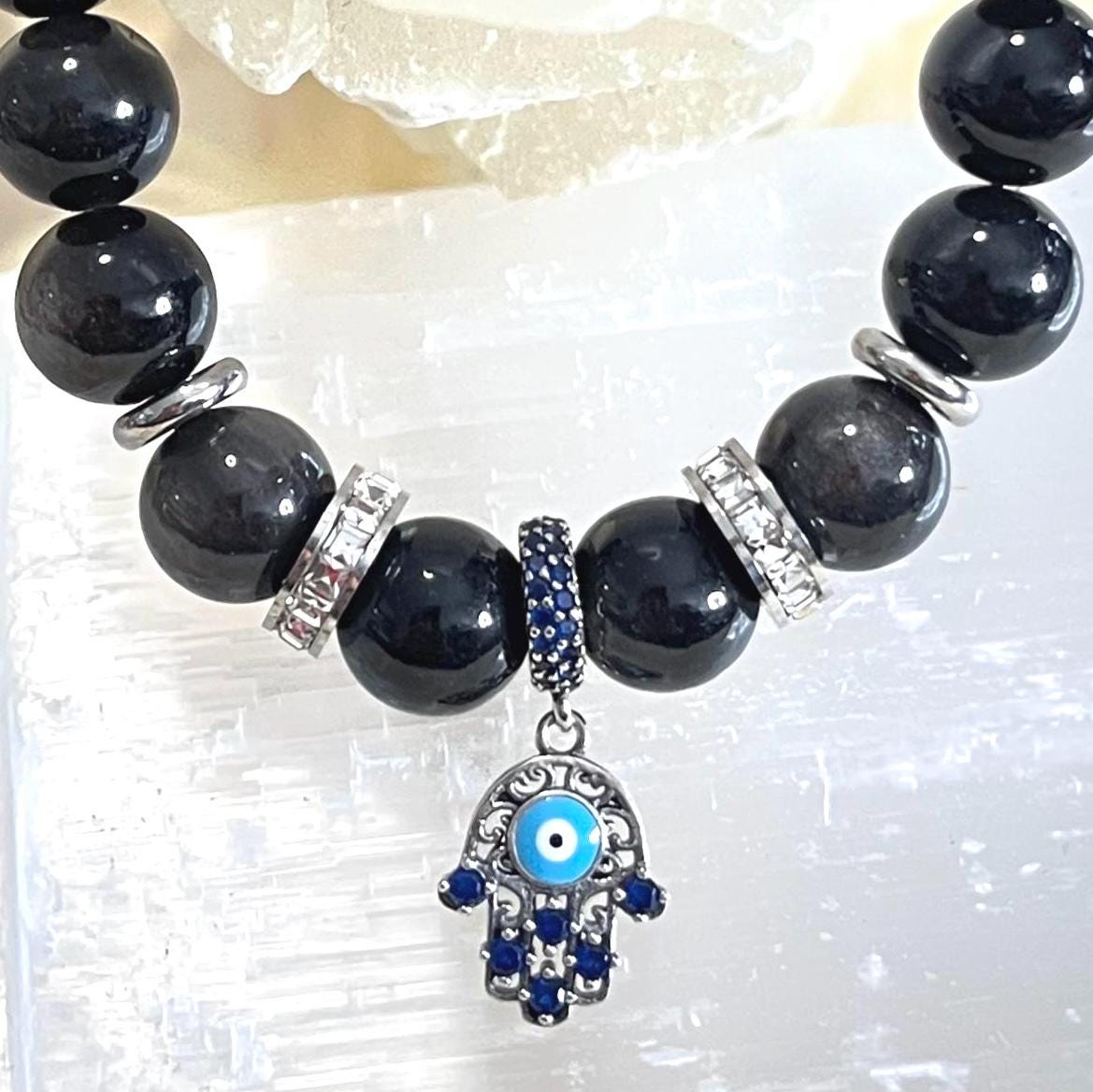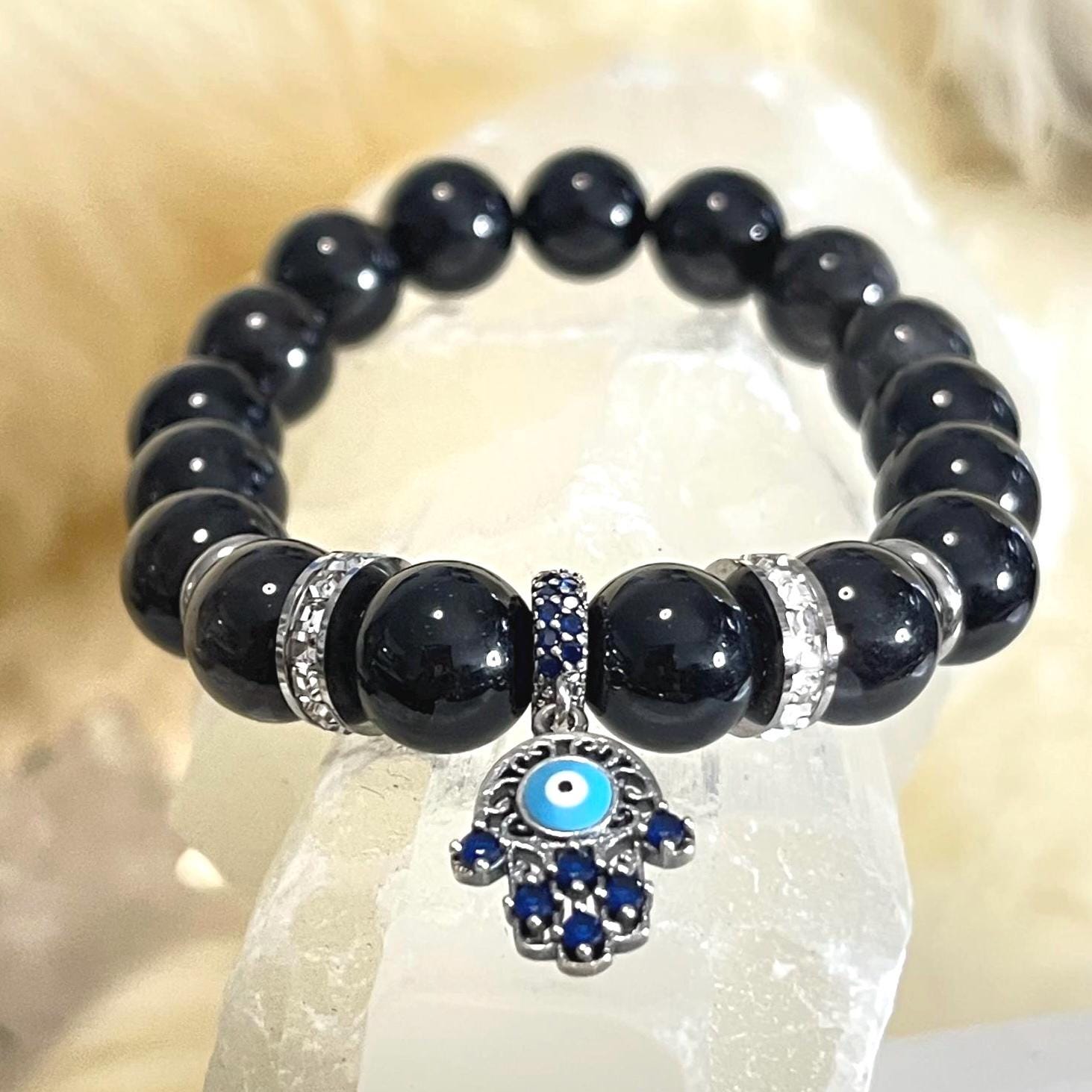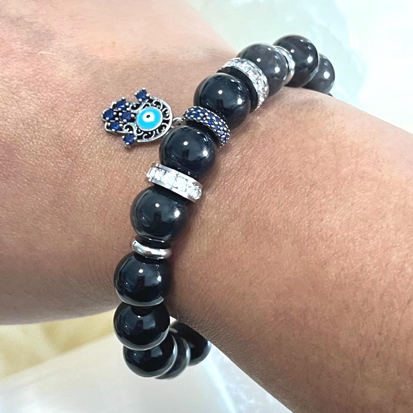 Protect your energy in style with this striking Obsidian gemstone bracelet, crafted with bold 10mm natural Black Obsidian beads and finished with powerful spiritual symbols — the 925 sterling silver Hamsa Hand and Evil Eye charm.