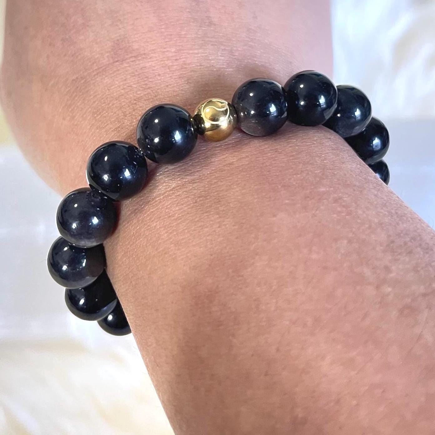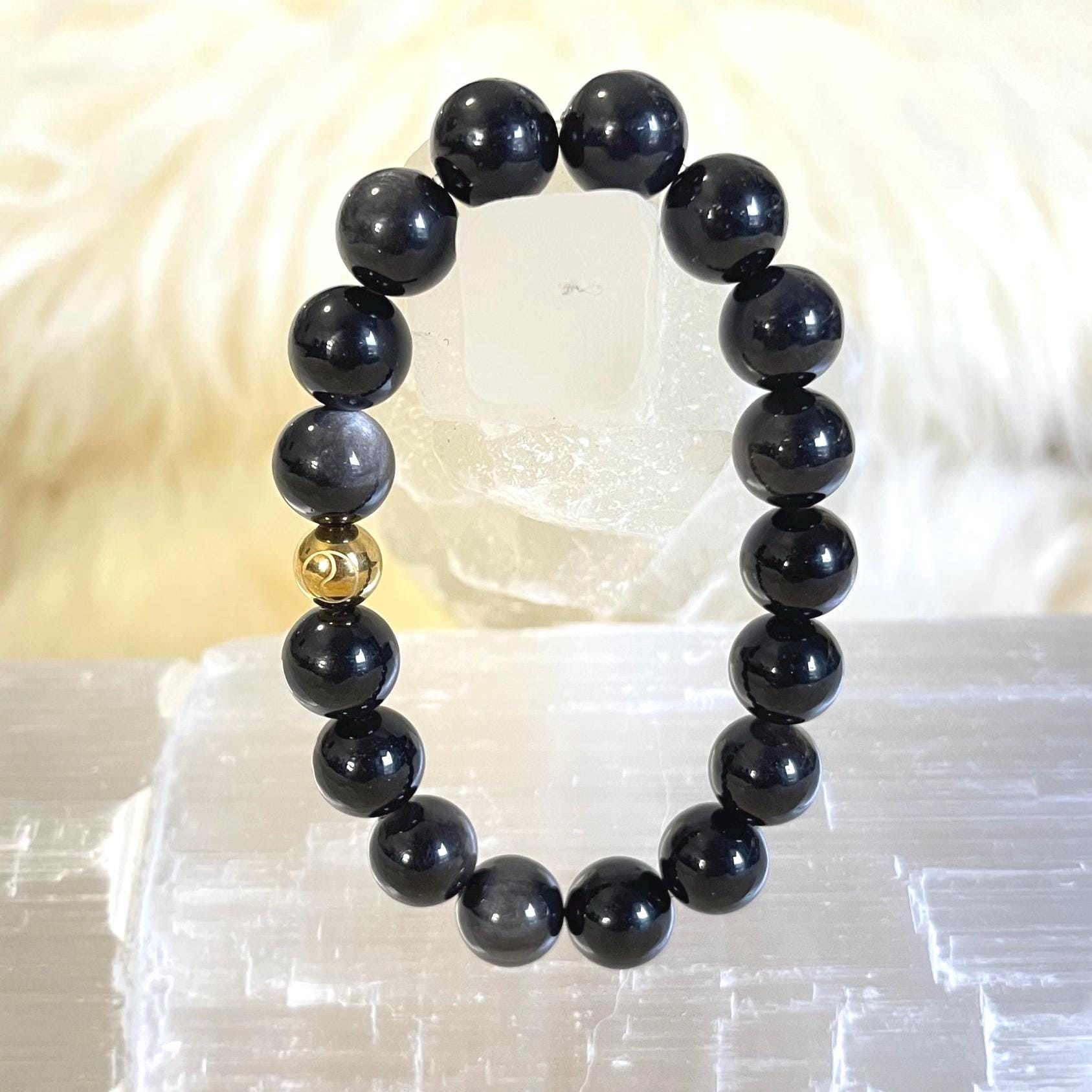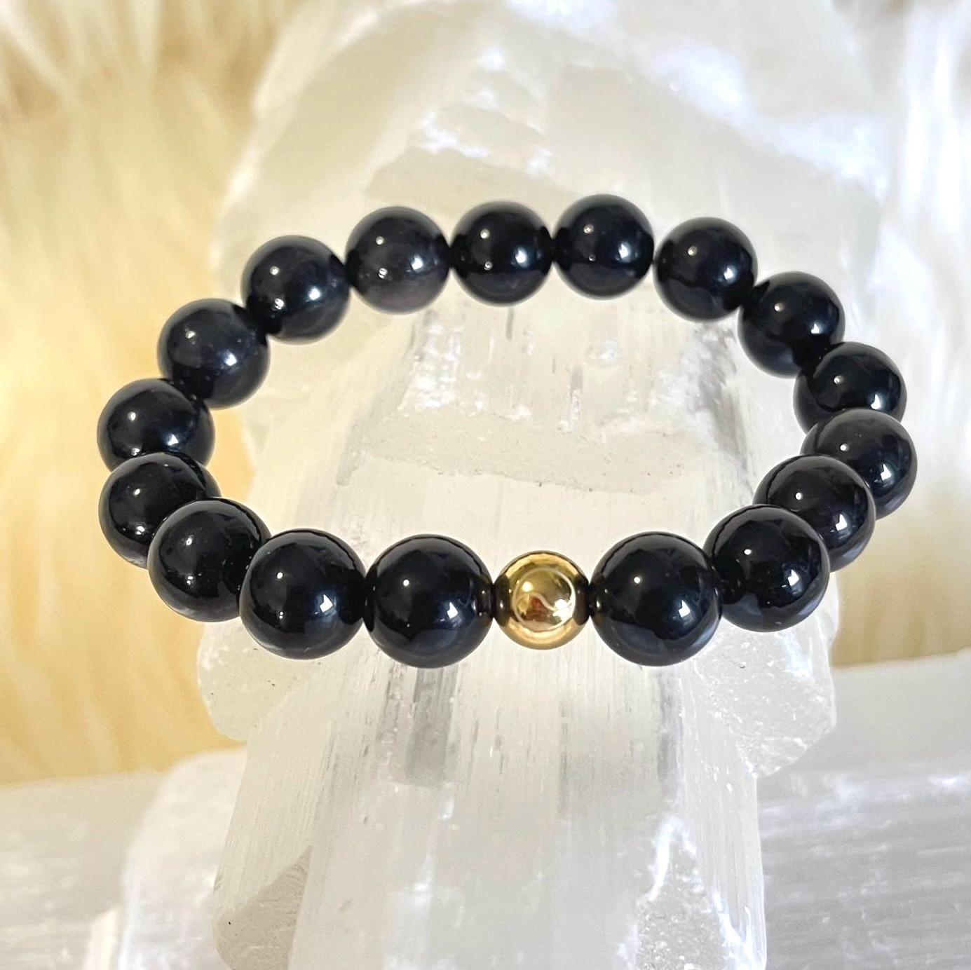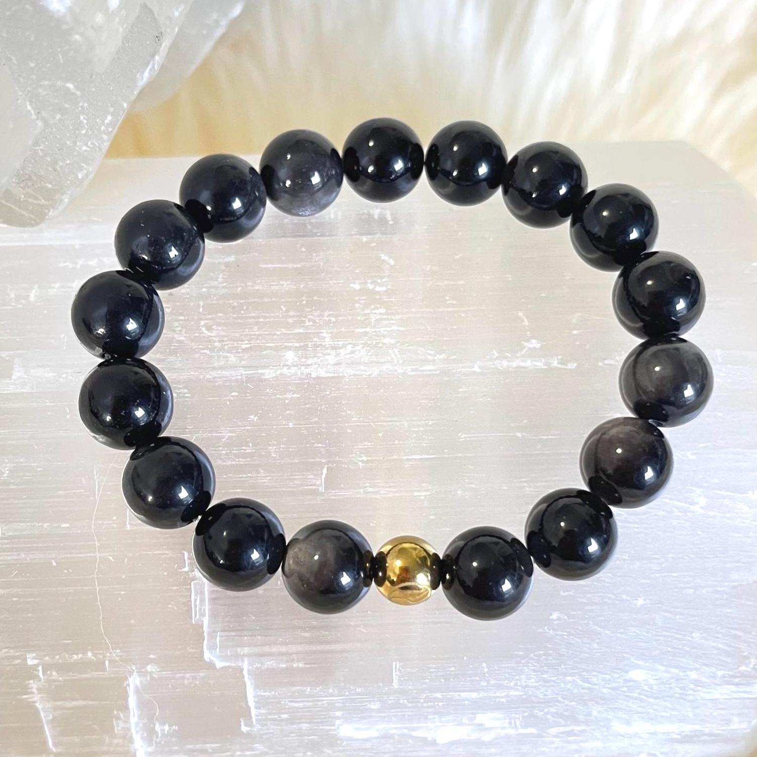 Luxury Minimalist 10mm Obsidian Bracelet with Gold Filled Accent – Spiritual Protection Jewelry on Elastic Cord