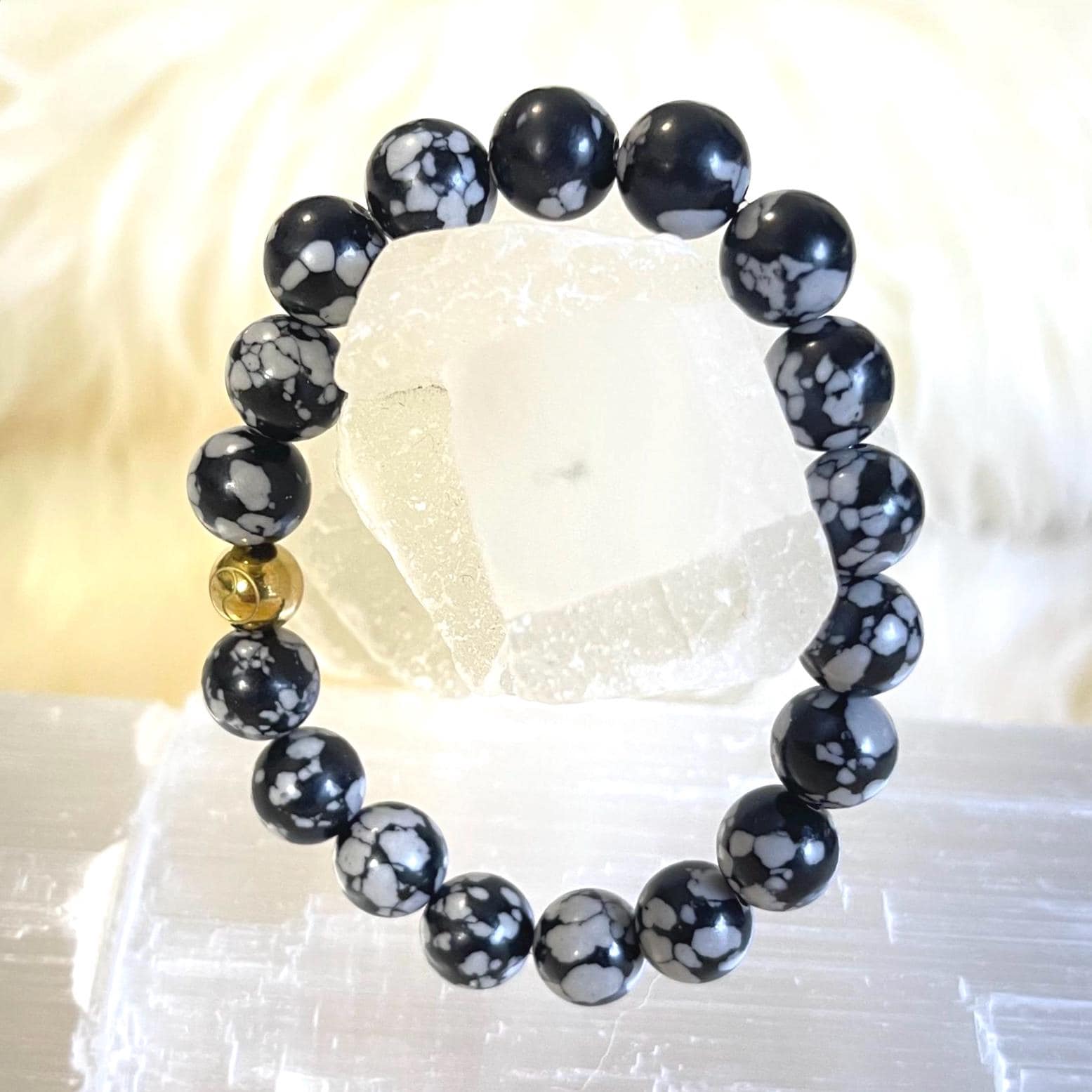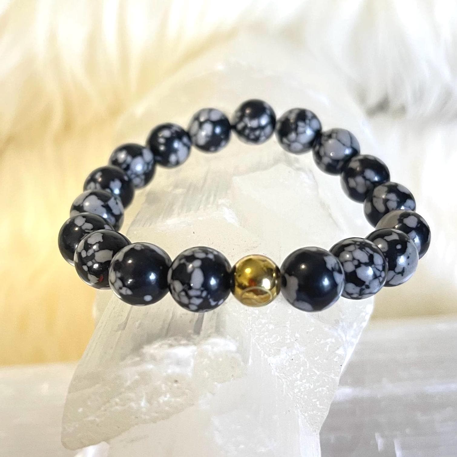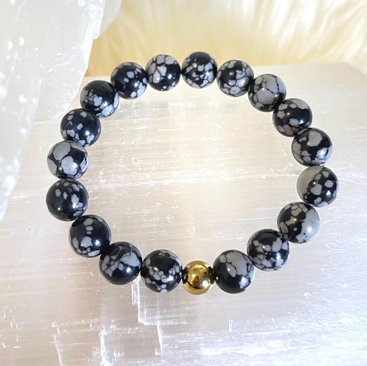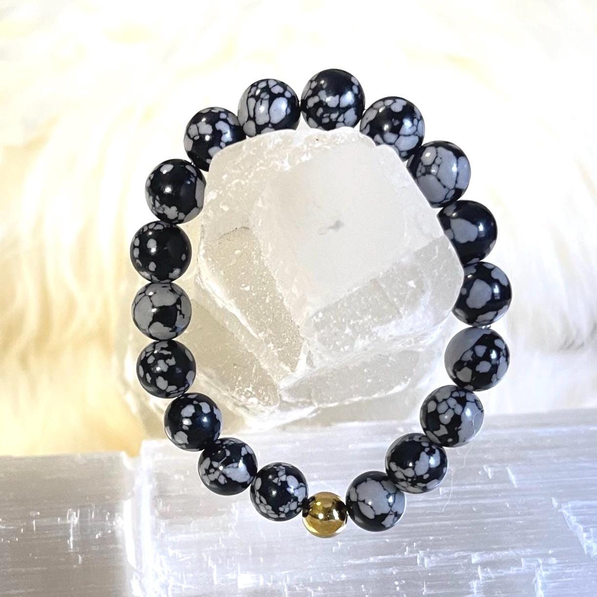 Refined, grounding, and effortlessly elegant, this luxury minimalist Snowflake Obsidian bracelet is handcrafted with genuine gemstone beads and finished with a luminous gold filled accent. With its striking black surface scattered with soft white “snowflake” patterns, this bracelet is a powerful symbol of balance, clarity, and inner peace.