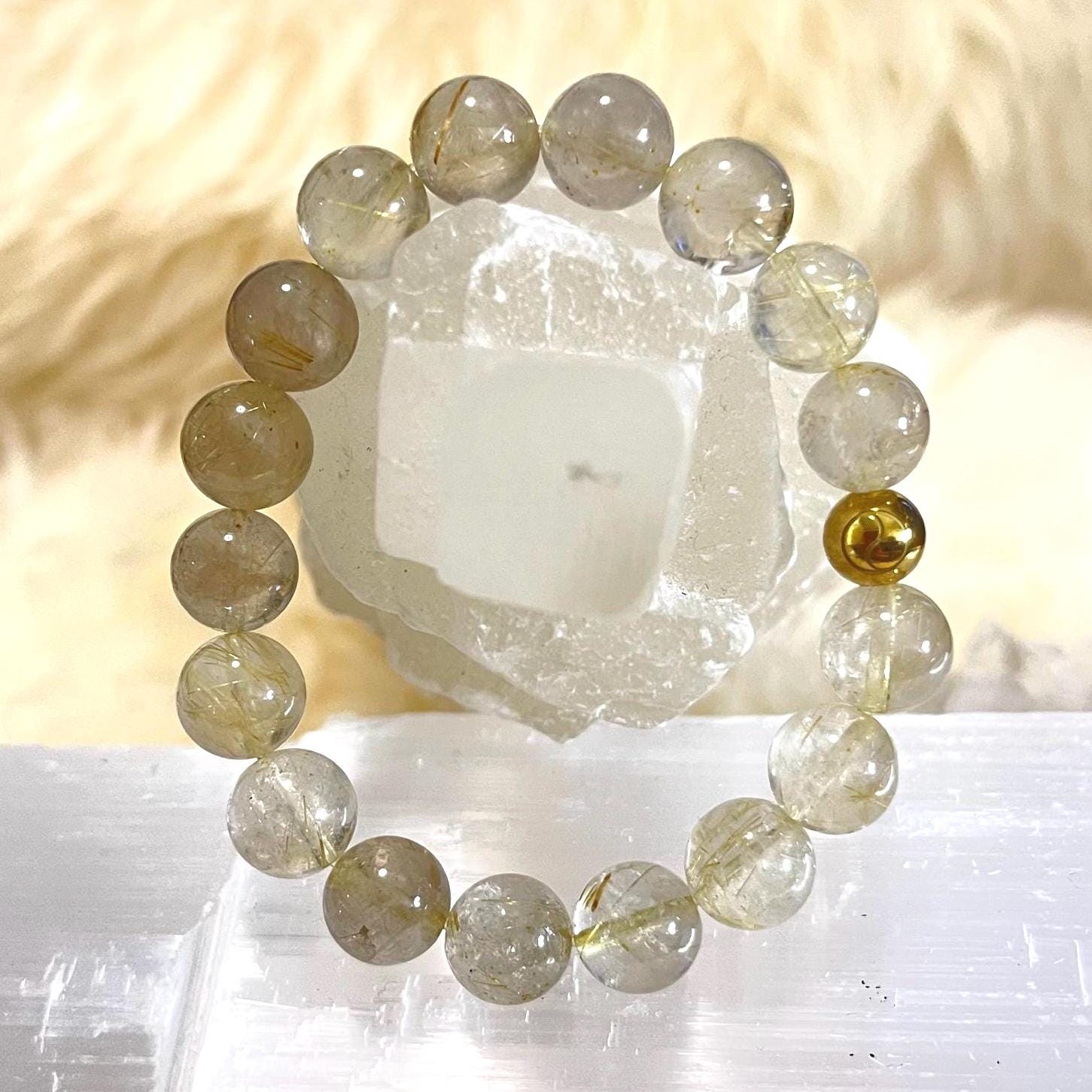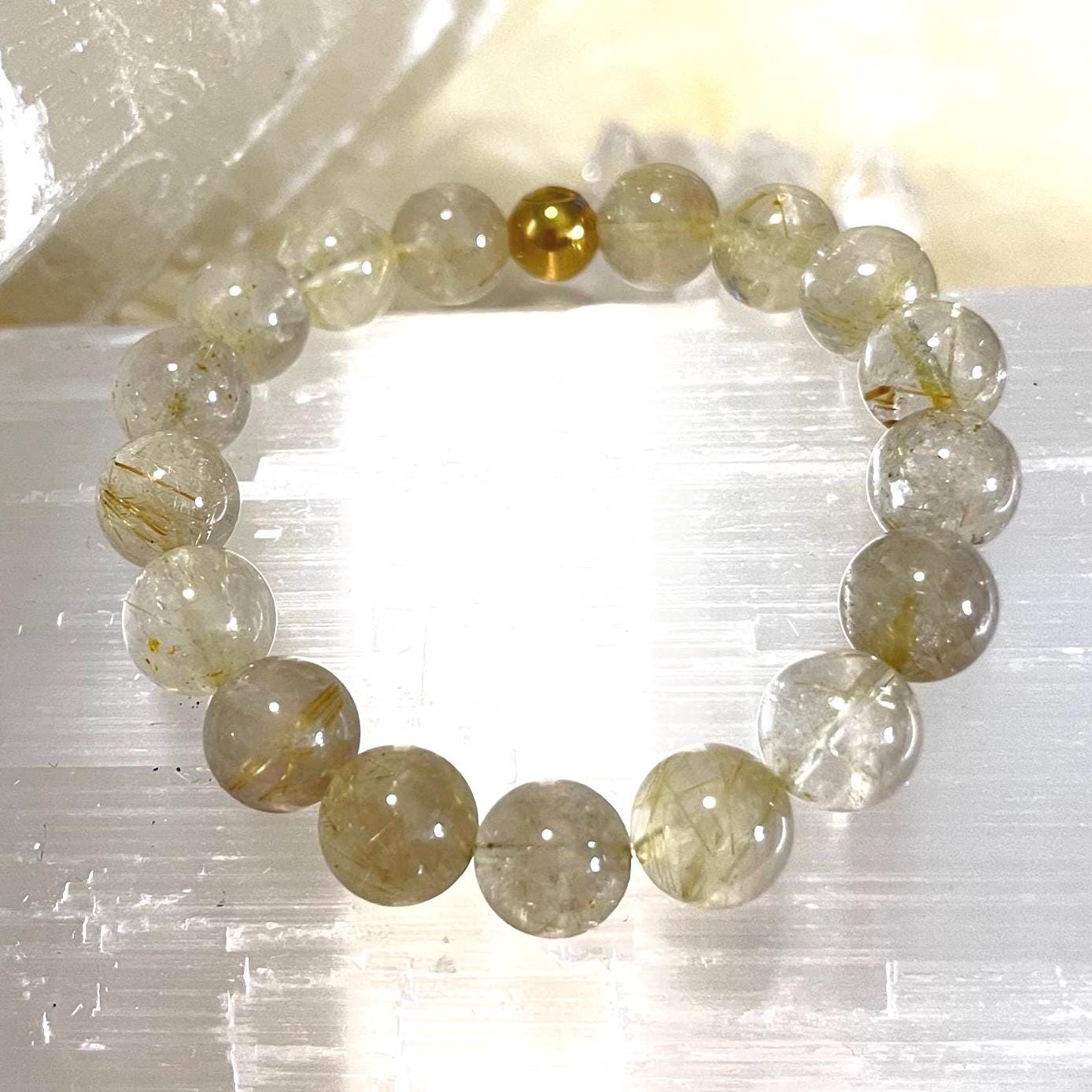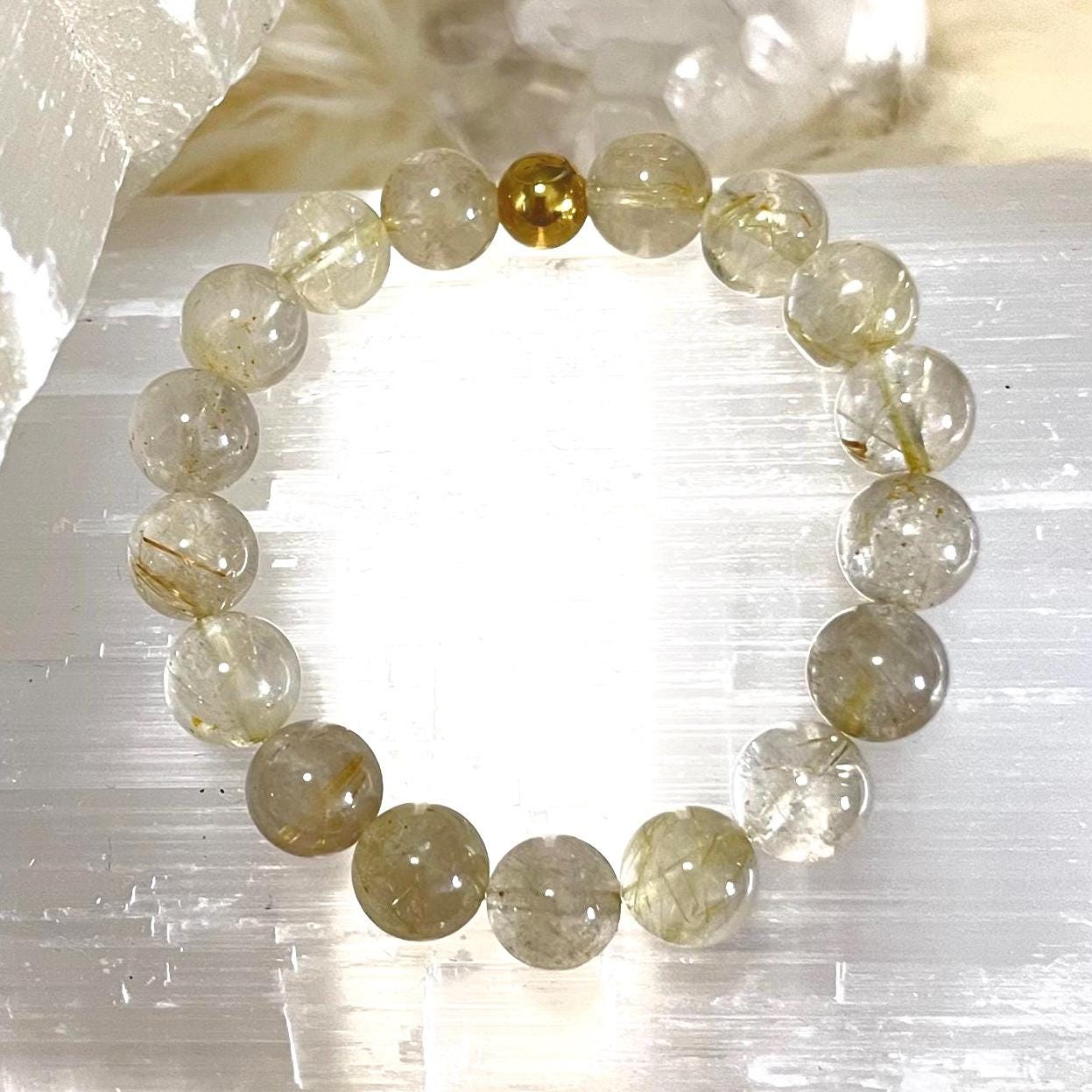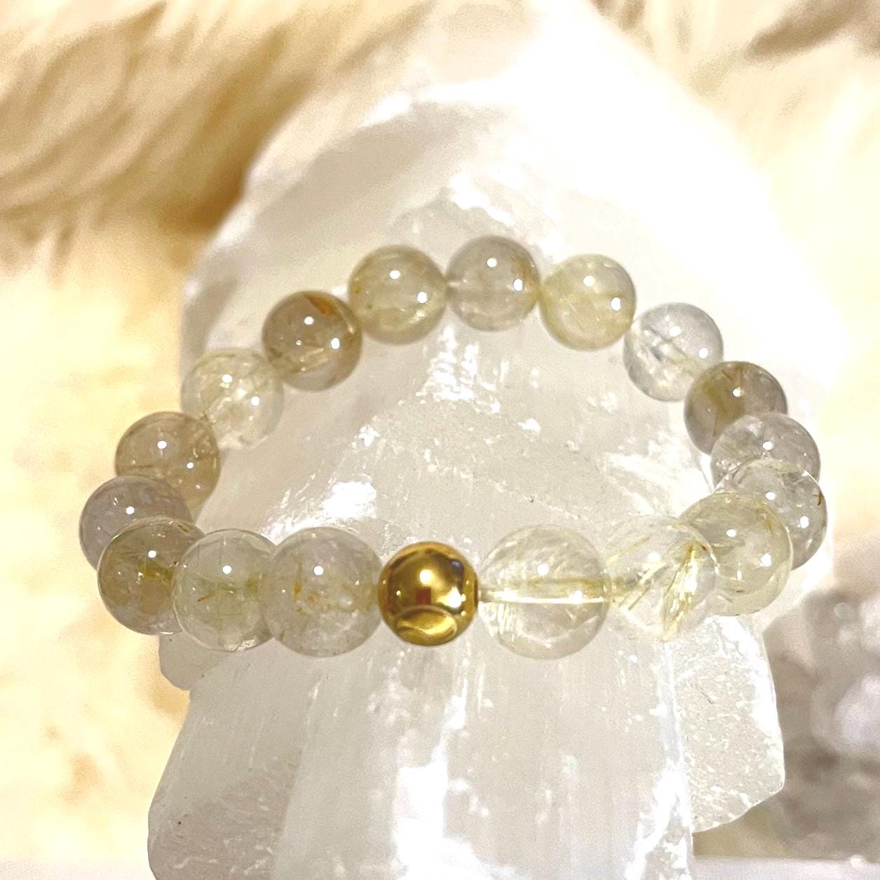rutile quartz bracelet, gold filled accent bracelet, unisex crystal bracelet, manifestation gemstone jewelry, minimalist stretch bracelet, healing quartz bracelet, 10mm gemstone bracelet, gift for him or her, luxury crystal jewelry, modern unisex accessory