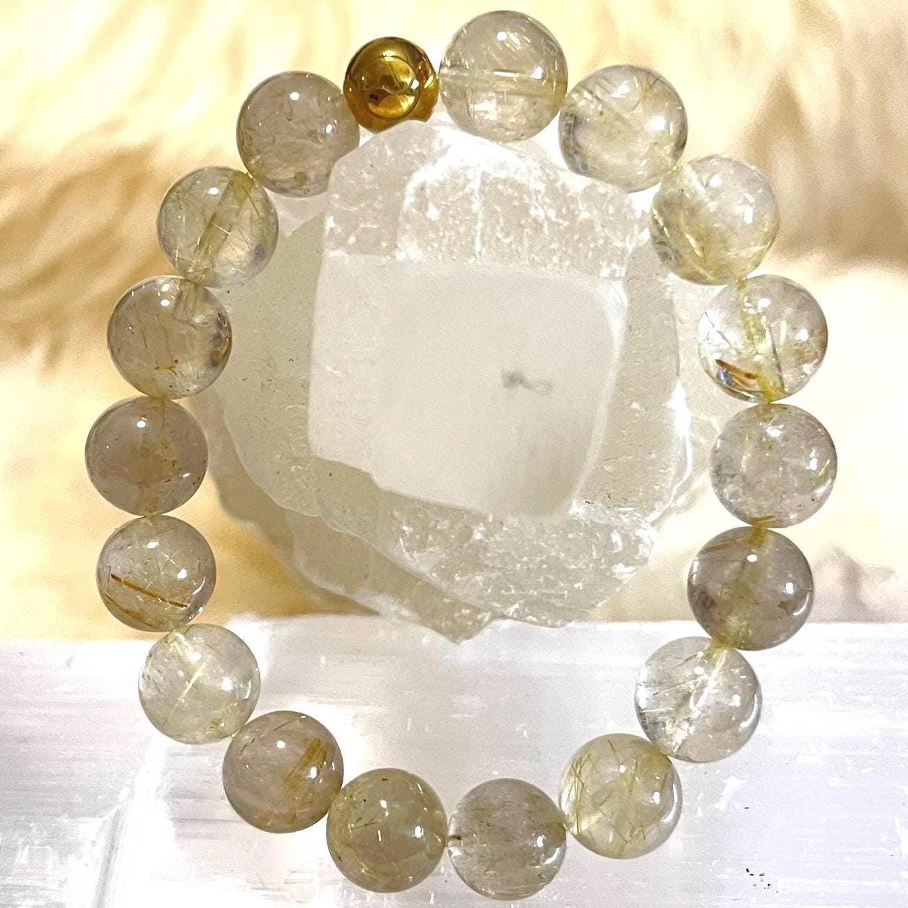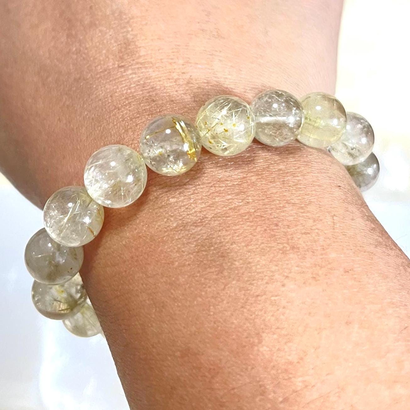Elevate your jewelry collection with the radiant beauty of this 10mm Rutile Quartz bracelet, designed with a refined gold filled accent for a modern minimalist finish. This unisex gemstone stretch bracelet combines natural elegance with powerful spiritual meaning, making it a timeless accessory for both men and women.
