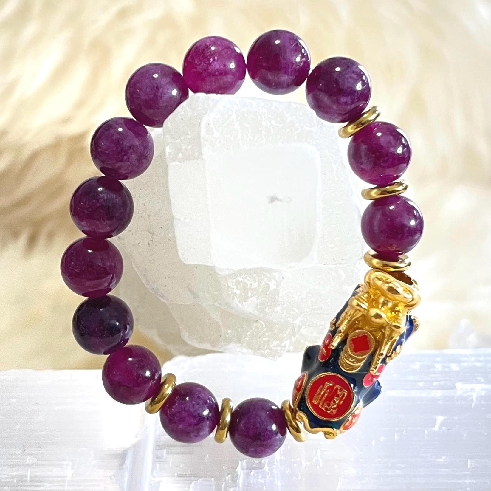 The combination of Lepidolite and the color-changing Dragon Pixiu creates a rare balance of energies: