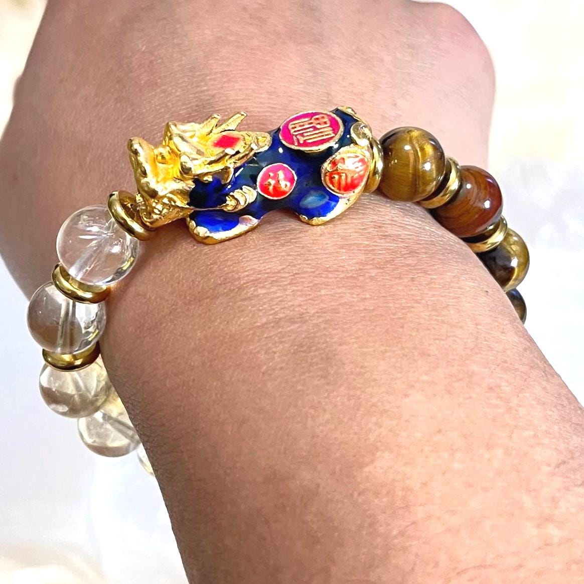 Pixiu and Tiger Eye together are believed to shield the wearer from misfortune and unwanted energy.