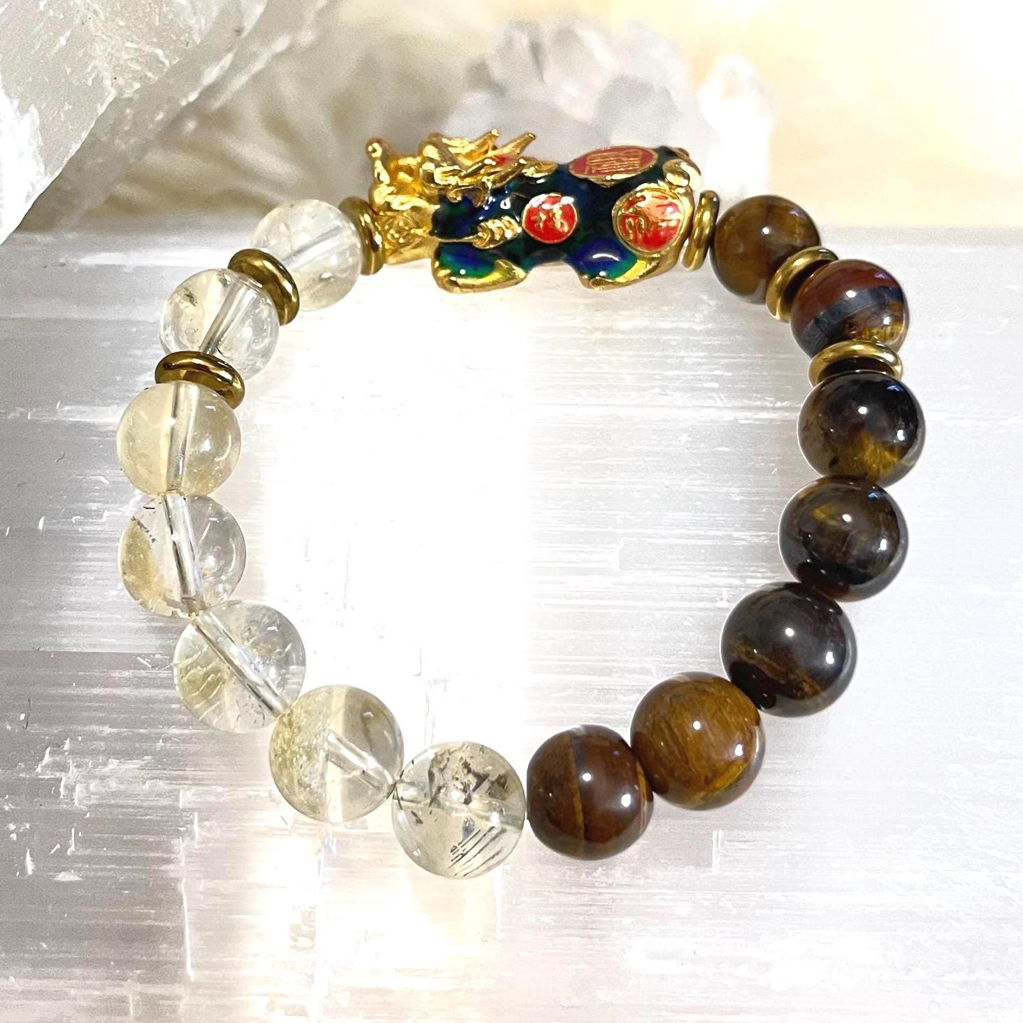 Pixiu Citrine Tiger Eye Bracelet | Wealth Bracelet Feng Shui | Money Attraction Crystal Bracelet | Tiger Eye Confidence Bracelet | Citrine Prosperity Bracelet 10mm | Pixiu Wealth Guardian Jewelry