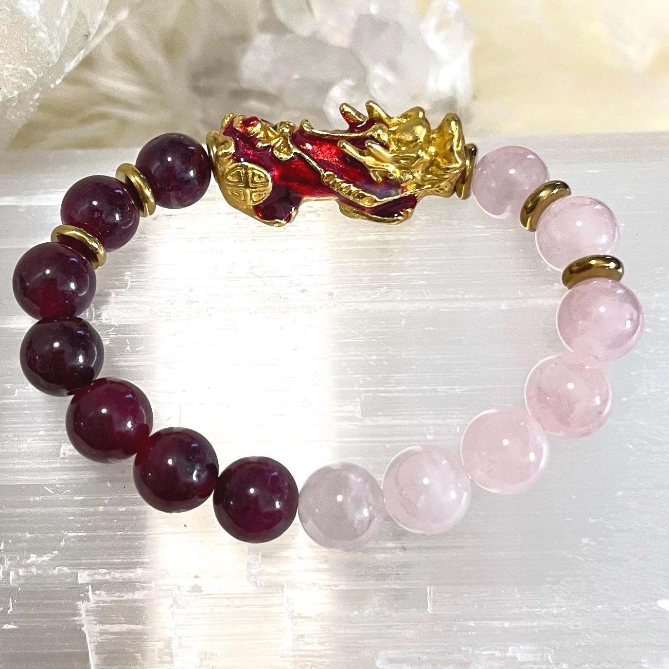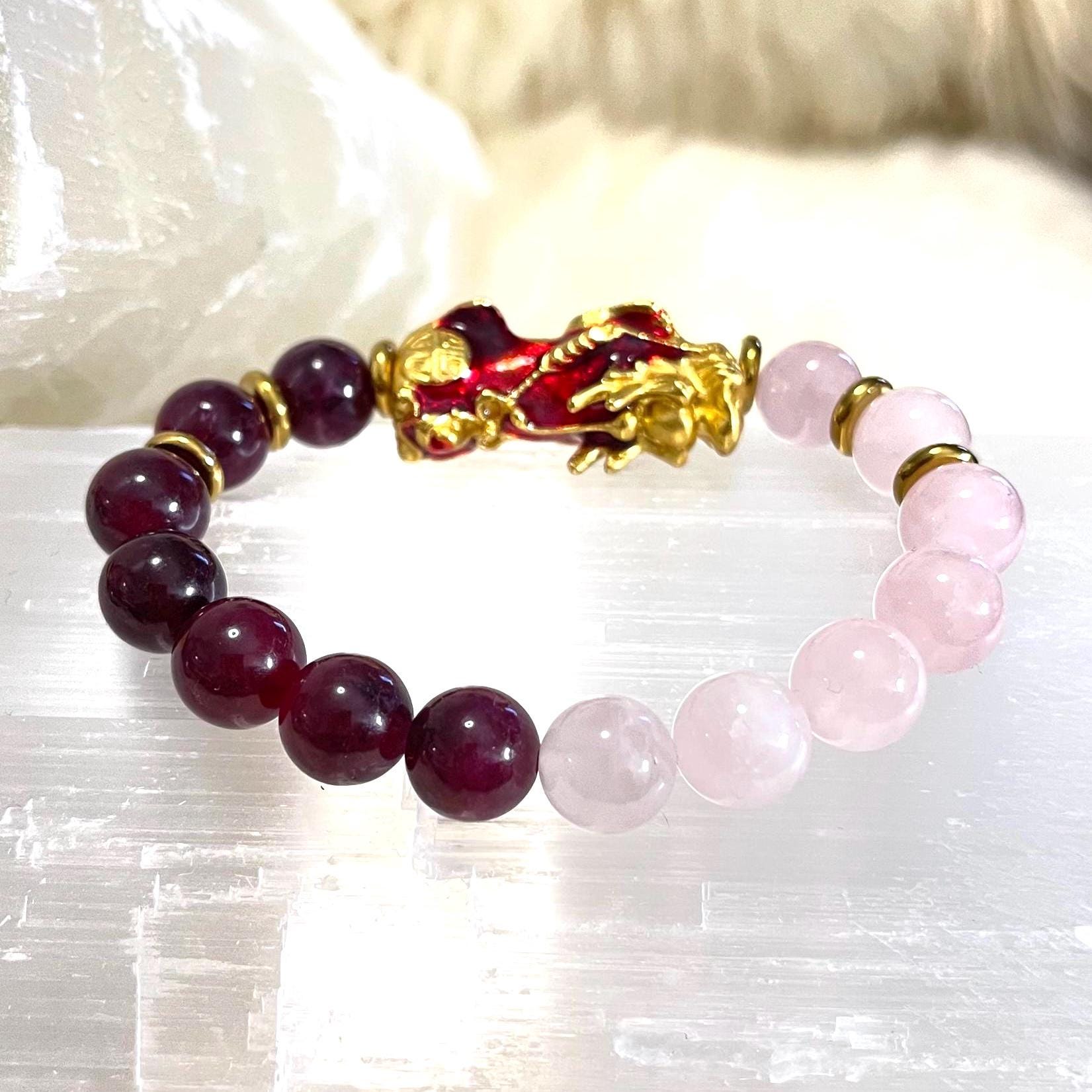 Garnet Rose Quartz Pixiu Bracelet 10mm | Feng Shui Love and Wealth Bracelet | Pixiu Prosperity Bracelet | Rose Quartz Love Crystal Bracelet | Garnet Passion Stone Jewelry | Money Attraction Bracelet Gift