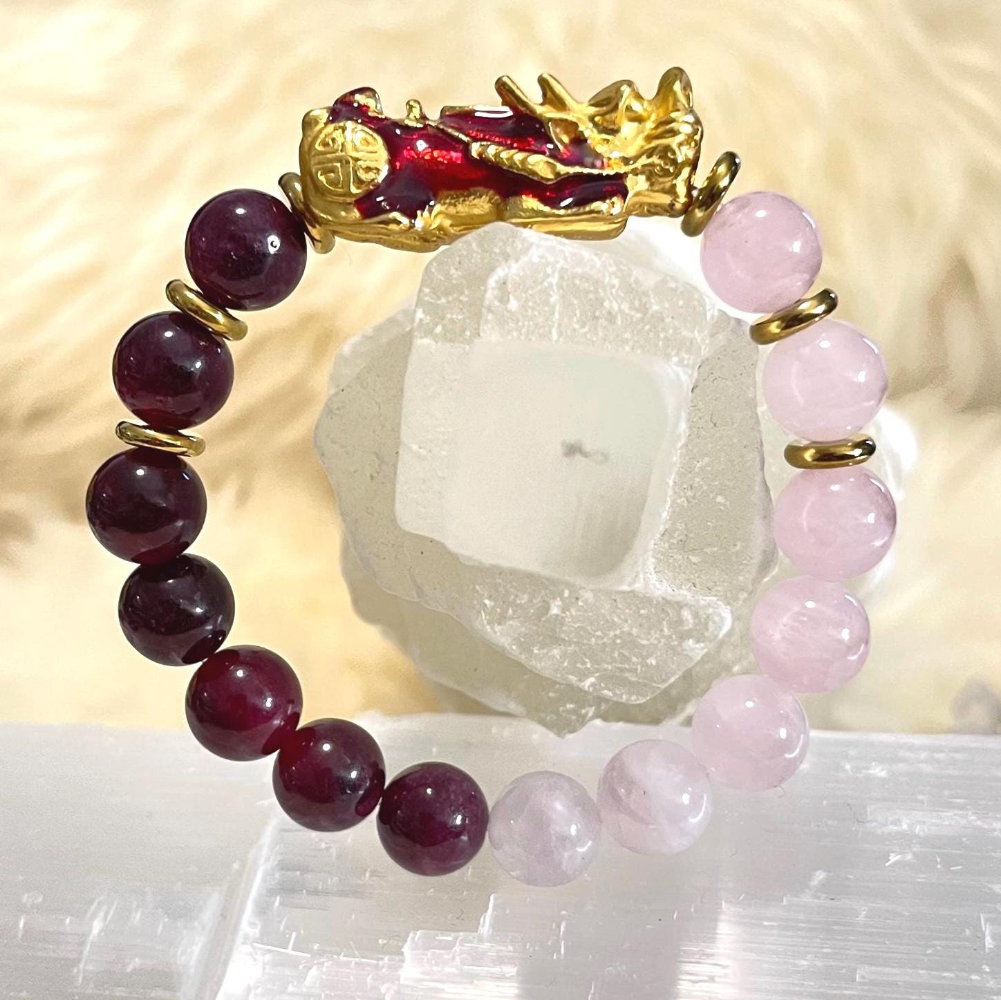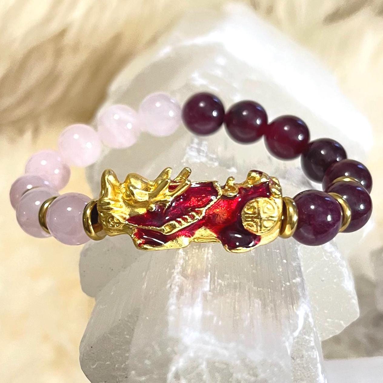Pixiu Duo Combo Bracelet 10mm – Garnet & Rose Quartz Love, Passion + Prosperity Talisman