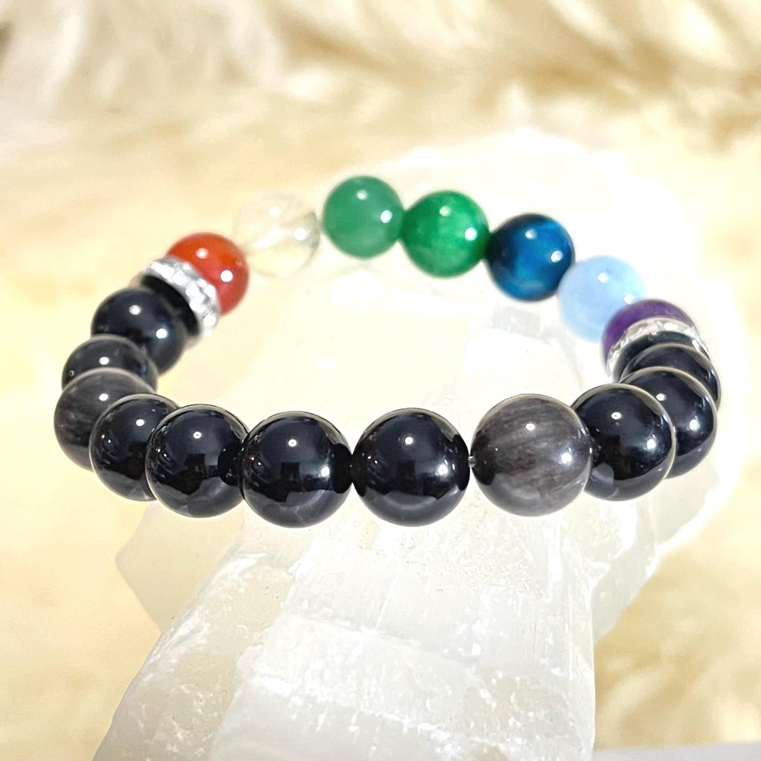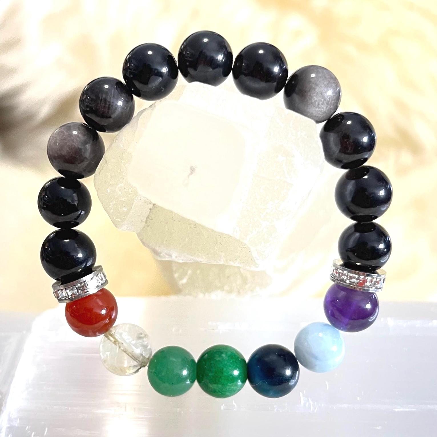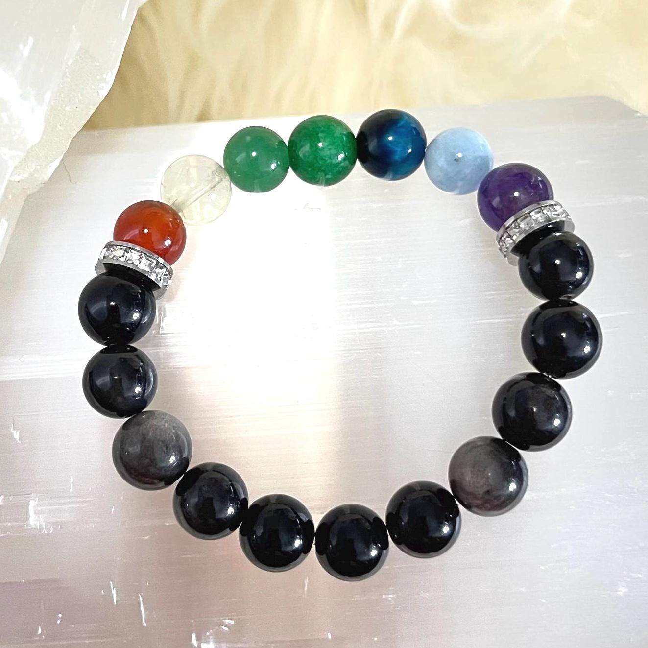 Meet your new everyday protection-and-balance piece: a handcrafted 10mm Obsidian 7 Chakra bracelet made with carefully selected natural stones and finished with sparkling rhinestone spacers plus sleek non-tarnish stainless steel details. The bold black shine of Obsidian gives this bracelet a clean, powerful look, while the 7 chakra stones add colorful intention and meaning. Strung on a strong elastic cord, it slips on easily and stays comfortable for all-day wear—perfect for meditation, mindfulness, yoga, or meaningful gifting.