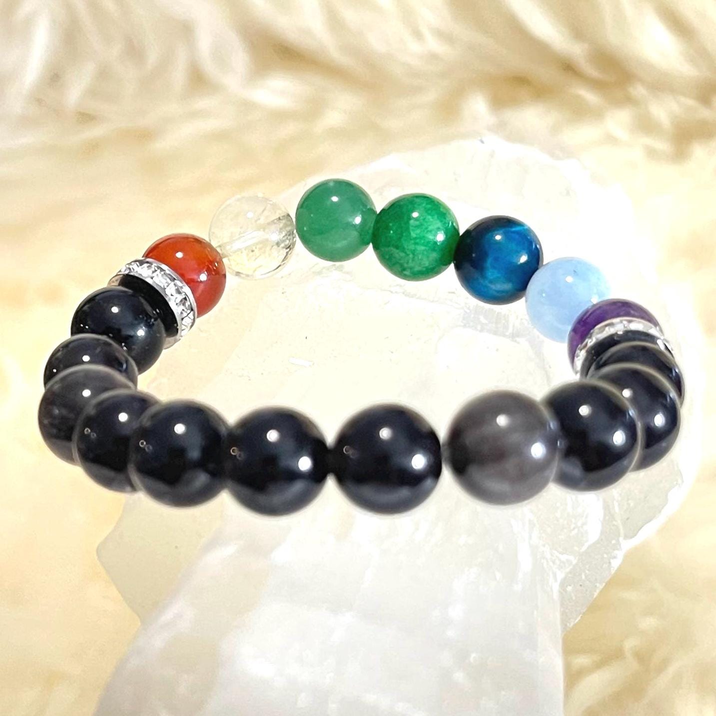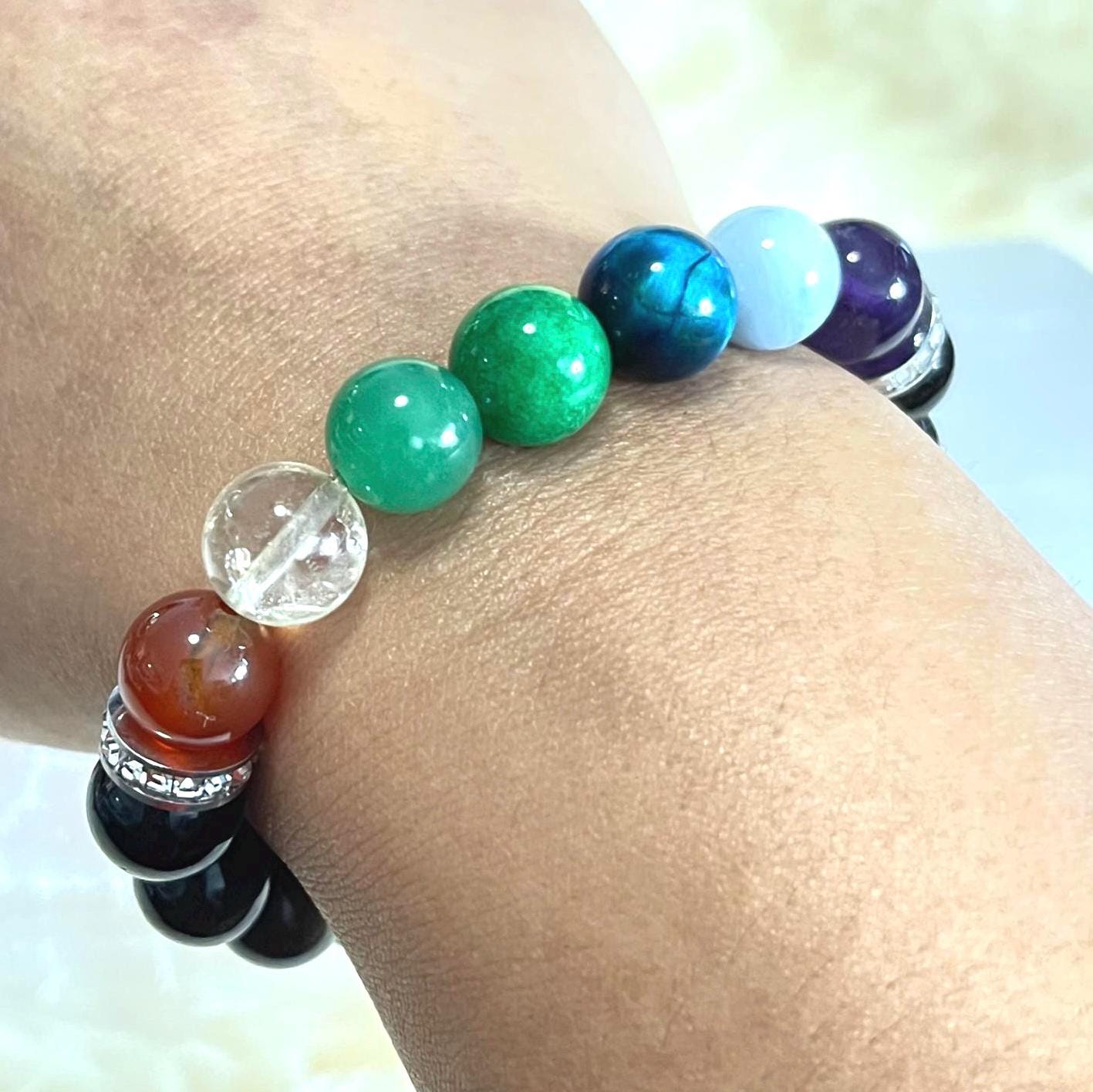 This design blends the grounding strength of Obsidian with the full-spectrum intention of the 7 chakra stones—creating a bracelet that feels protective yet uplifting. It combines calm and clarity stones (Amethyst, Aquamarine) with focus and motivation boosters (Blue Tiger Eye, Citrine, Carnelian), while Jade and Aventurine keep the energy soft, balanced, and heart-centered. The rhinestone accents add just the right touch of sparkle, making it easy to wear every day or gift with meaning.