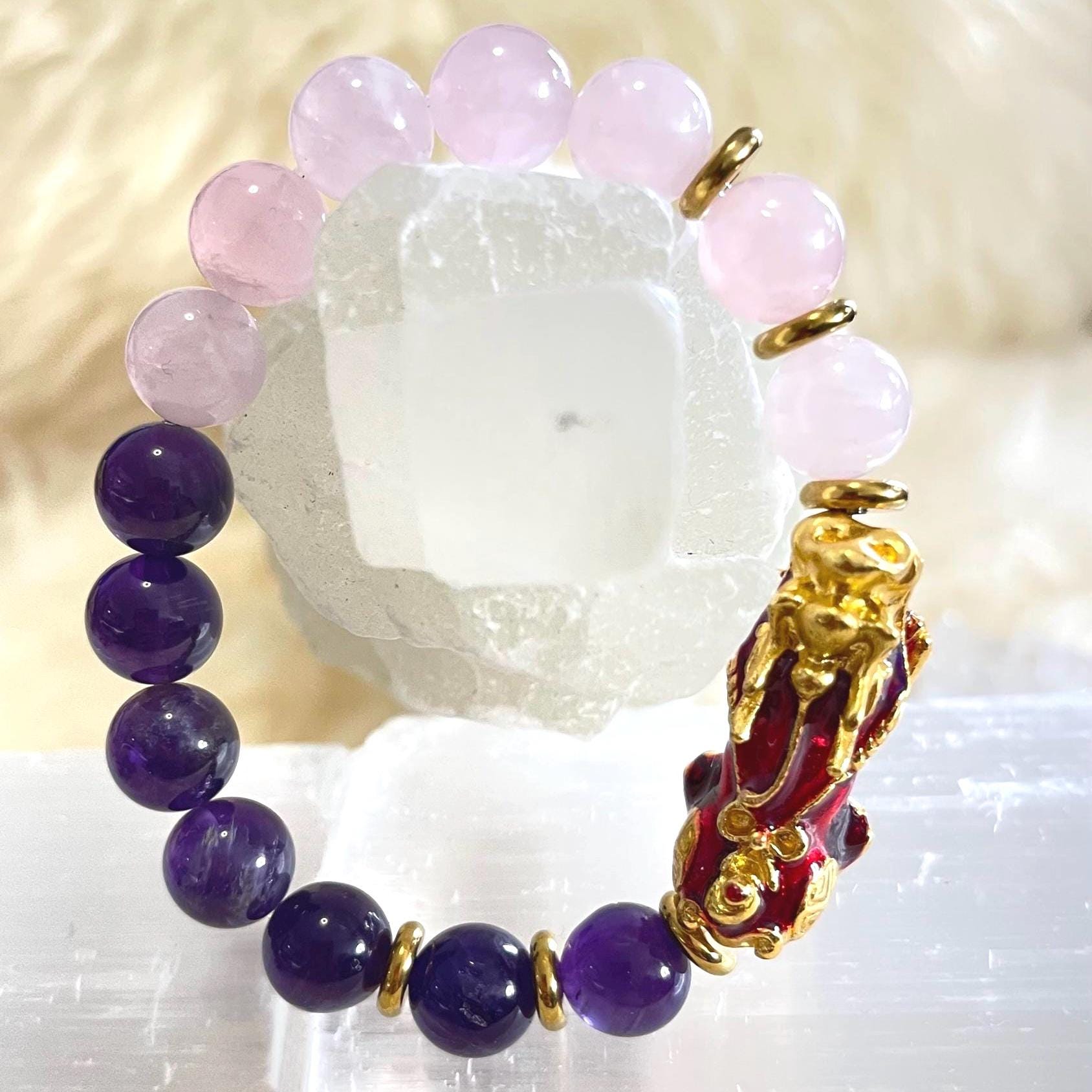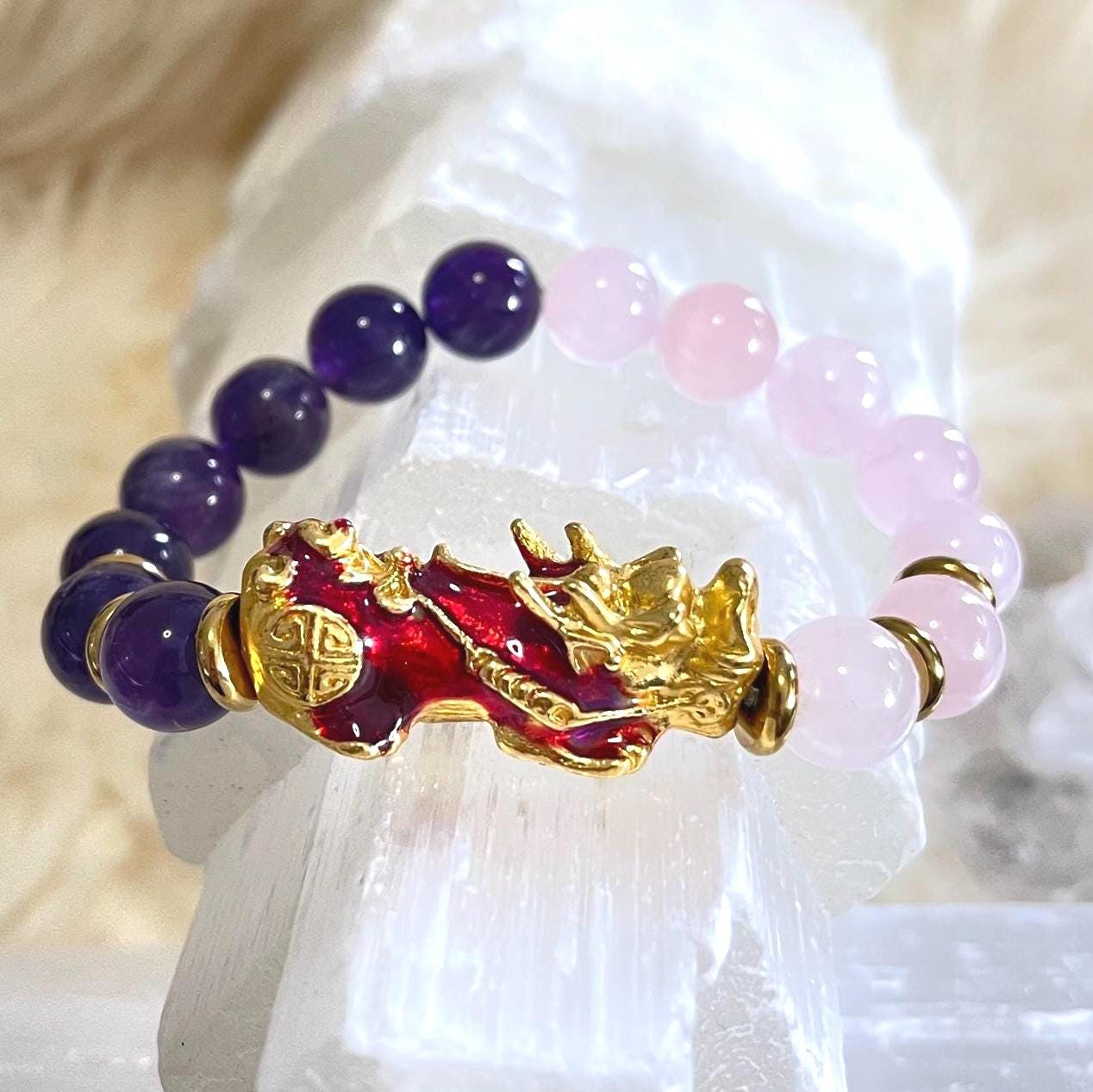 Amethyst Rose Quartz Pixiu Bracelet 10mm | Feng Shui Love and Wealth Bracelet | Pixiu Prosperity Bracelet | Rose Quartz Love Crystal Jewelry | Amethyst Protection Bracelet | Money Attraction Bracelet Gift